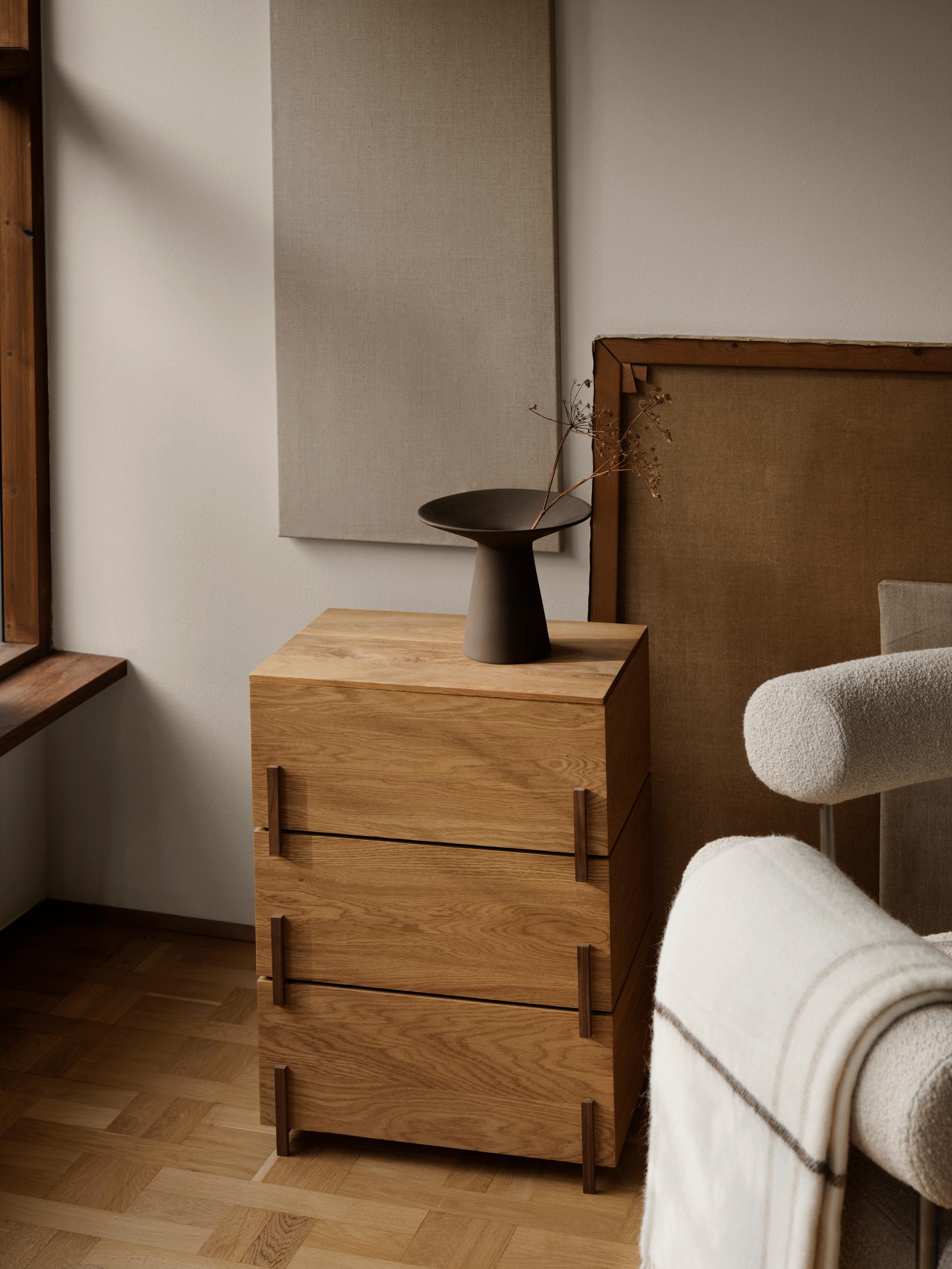 The Collar Vase embodies Kristina Dam Studio’s ethos of ‘Sculptural Minimalism’ with its clean, architectural form. Crafted from terracotta with a matte brown finish, it features an interior glaze for waterproof durability, making it ideal for both lush bouquets and solitary branches. Available in two sizes, each variation showcases a unique silhouette.