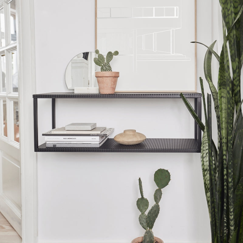 The Kristina Dam Grid Wall Shelf is a beautiful wall mounted storage solution that is minimal and modern in design. Stripped back to it's essential elements, the Grid Wall Shelf features two power-coated metal shelfs for you to decorate or store your favorite items.