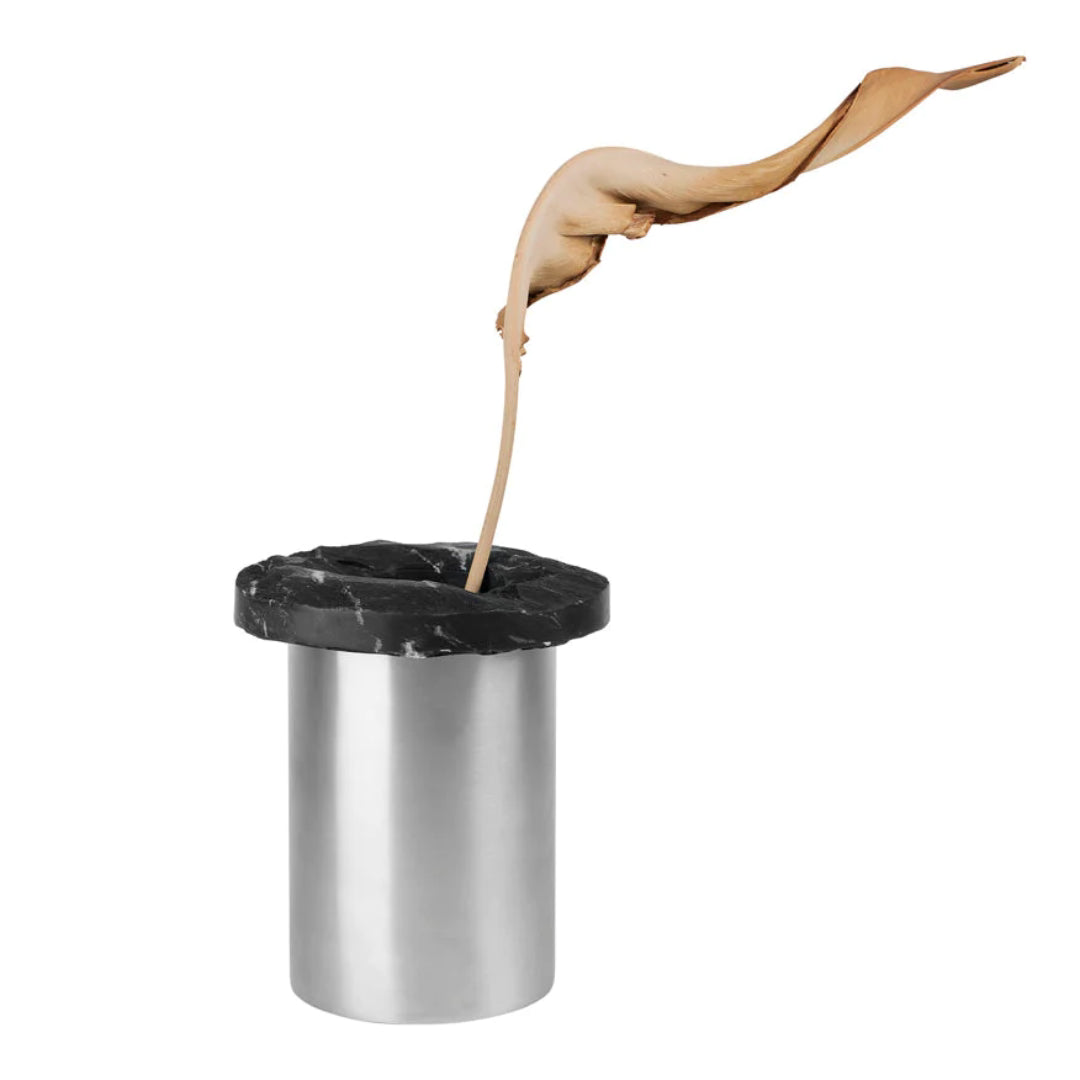 The Rock Vase from Kristina Dam Studio exemplifies the art of contrast in design. Its striking interplay of shapes captures attention, harmonizing the contemporary precision of a sleek, brushed stainless steel base with the natural allure of a rugged black marble top. This juxtaposition not only yields a visually striking piece but also evokes a harmonious balance and dynamic tension. More than just a vessel for flowers, it transcends functionality to become a sculptural masterpiece fit for any modern interior's centerpiece.