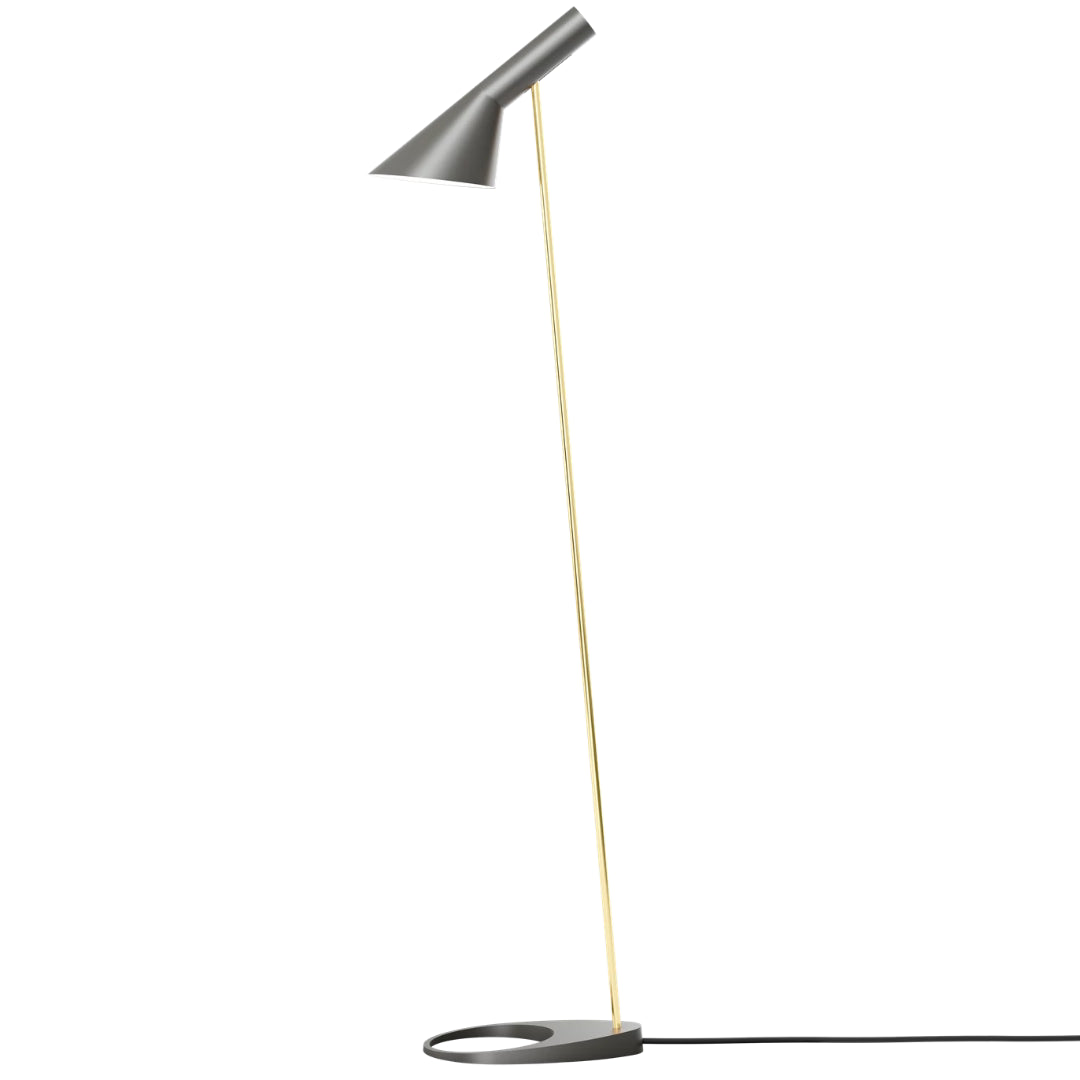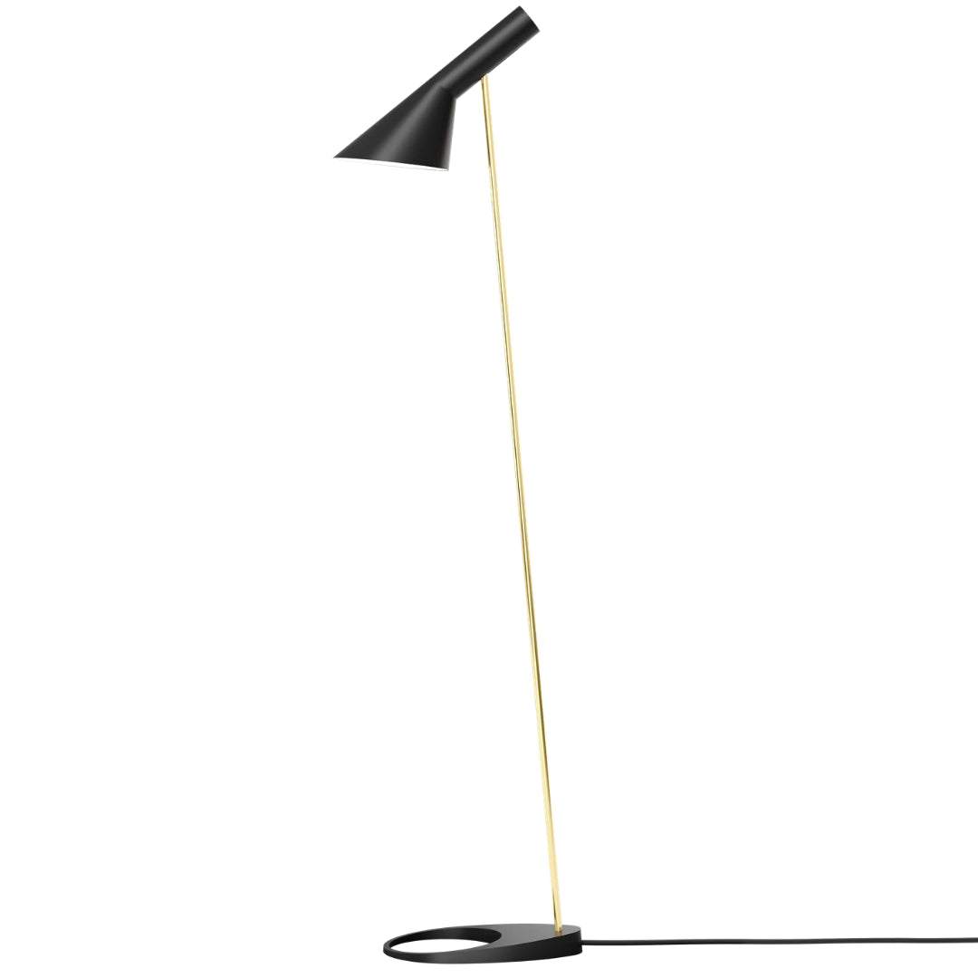 The design of the Louis Poulsen AJ Floor lamp is based on a shade whose shape comprises two geometric shapes: the cylinder (the socket) and the cone (the shade). The lamp concentrates the light where it is needed, and the design is ideal for use as both a work light and a reading lamp. The unusual angles of the AJ lamp, along with the volume of the shade and the circular hole in the foot, imbue it with a pronounced sculptural quality.