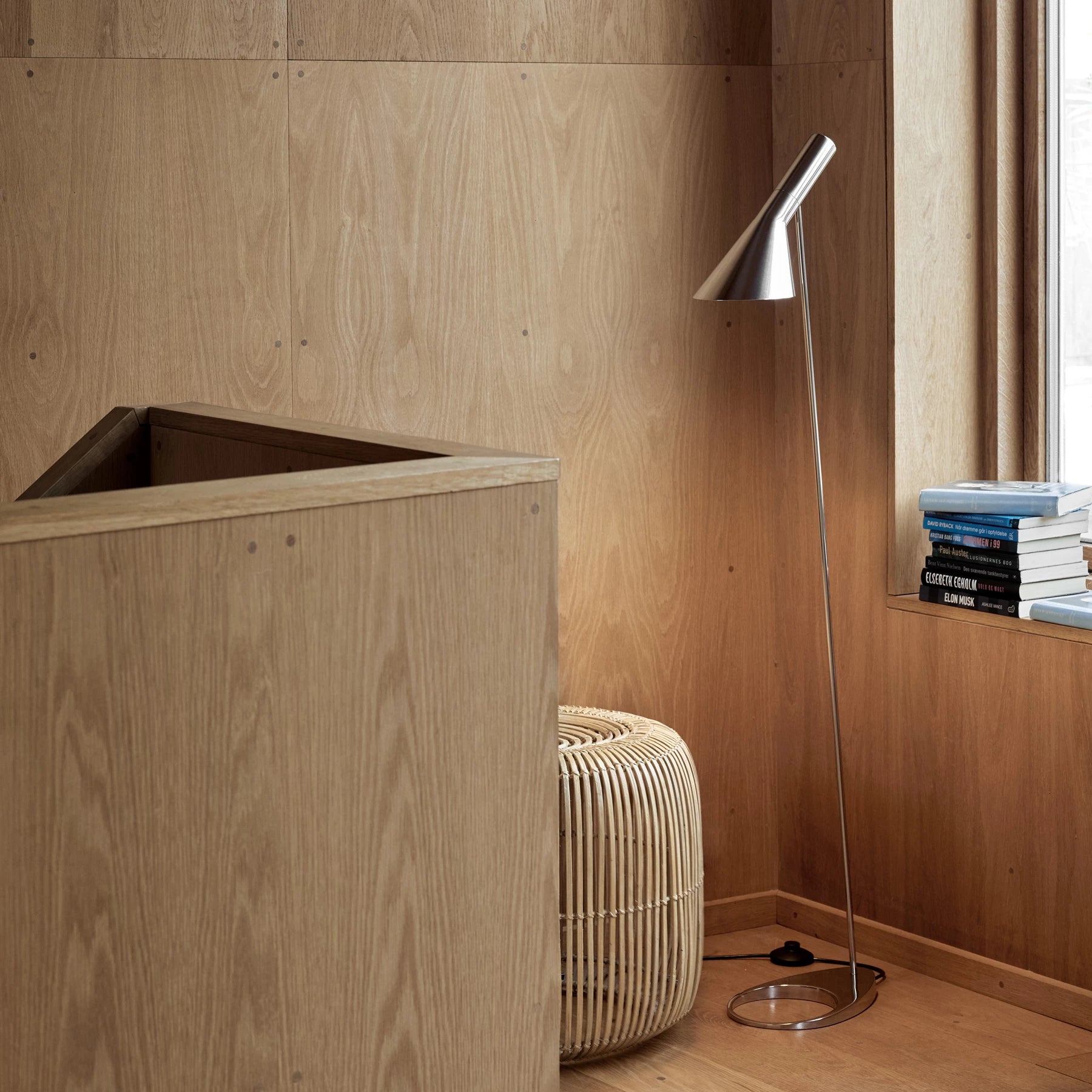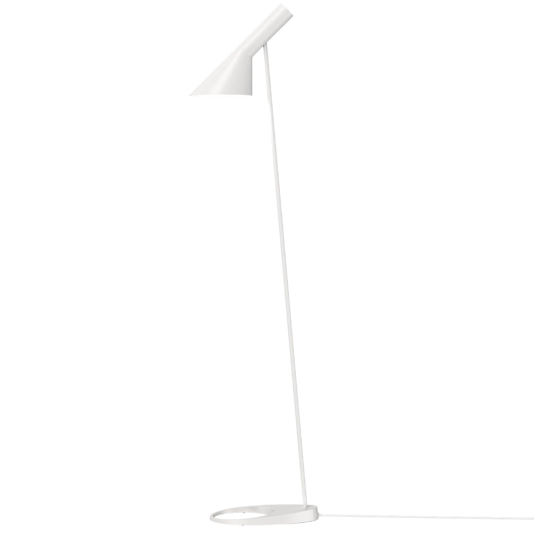 The design of the Louis Poulsen AJ Floor lamp is based on a shade whose shape comprises two geometric shapes: the cylinder (the socket) and the cone (the shade). The lamp concentrates the light where it is needed, and the design is ideal for use as both a work light and a reading lamp. The unusual angles of the AJ lamp, along with the volume of the shade and the circular hole in the foot, imbue it with a pronounced sculptural quality.