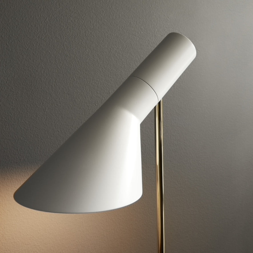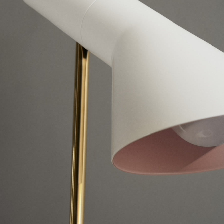 The AJ Table Lamp - 150th Anniversary from Louis Poulsen, designed by Arne Jacobsen in 1957 for the SAS Royal Hotel in Copenhagen, is a stylish piece of history that complements any setting with its Mid-Century Modern charm. This limited edition lamp celebrates 150 years with a special brass finish and Pale Rose interior. Its design features a conical shade intersecting a cylindrical base, directing light precisely where needed. The minimalist, geometric design and Pale Rose interior provide a welcoming, even light, making it ideal for desktops or bedside tables.