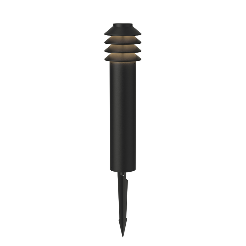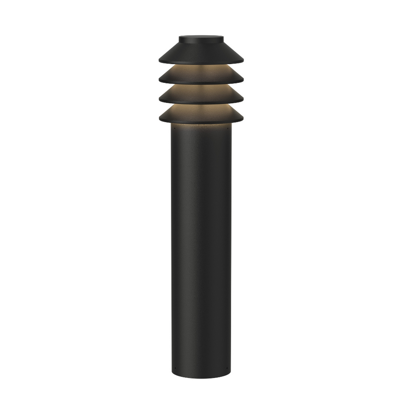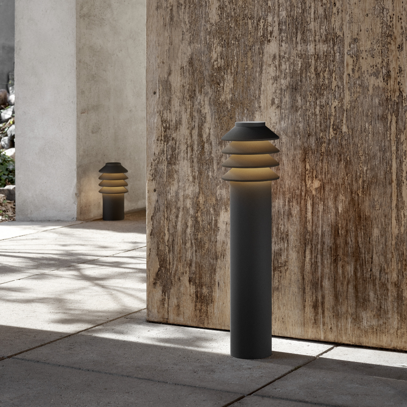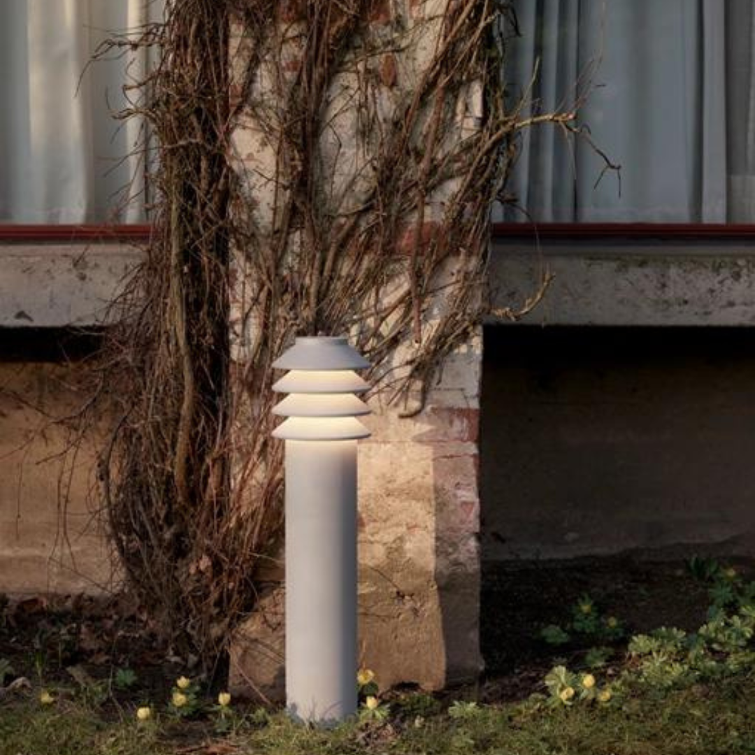 Bysted Garden LED Long Bollard is a downscaled version of Danish architect Peter Bysted's original 1975 design. The bollard is characterized by its four rings and the intriguing soft/diffused/ambient symmetric light pattern it creates on the ground.