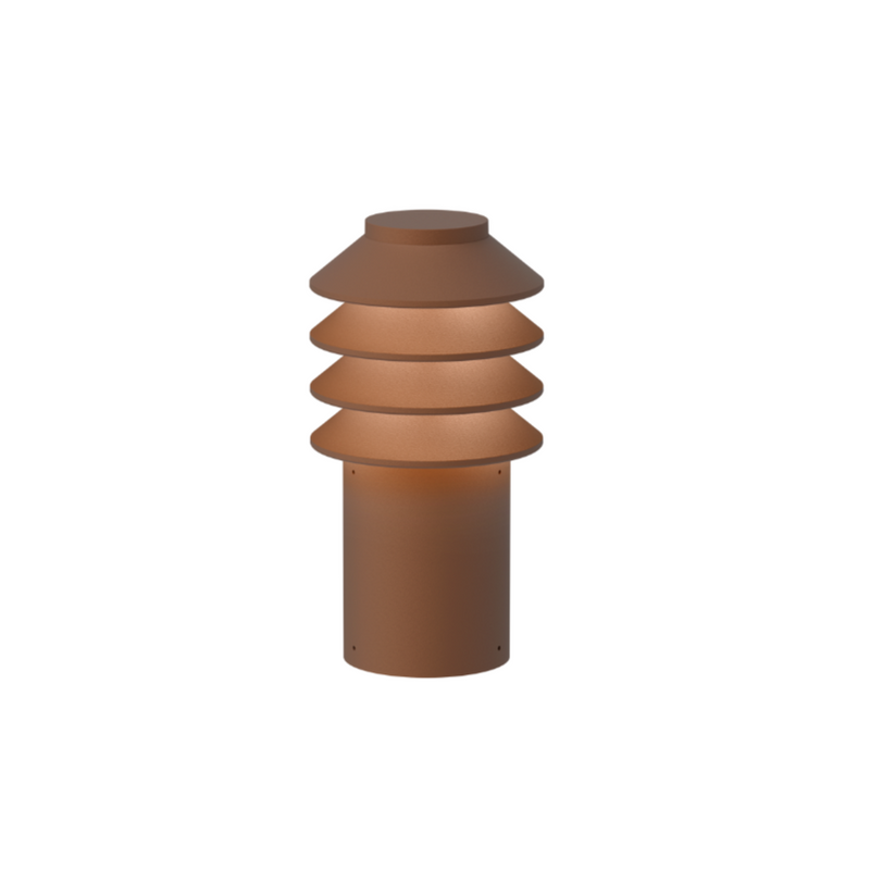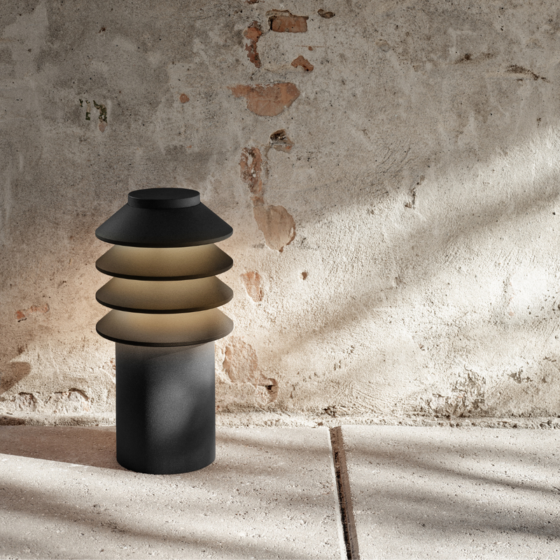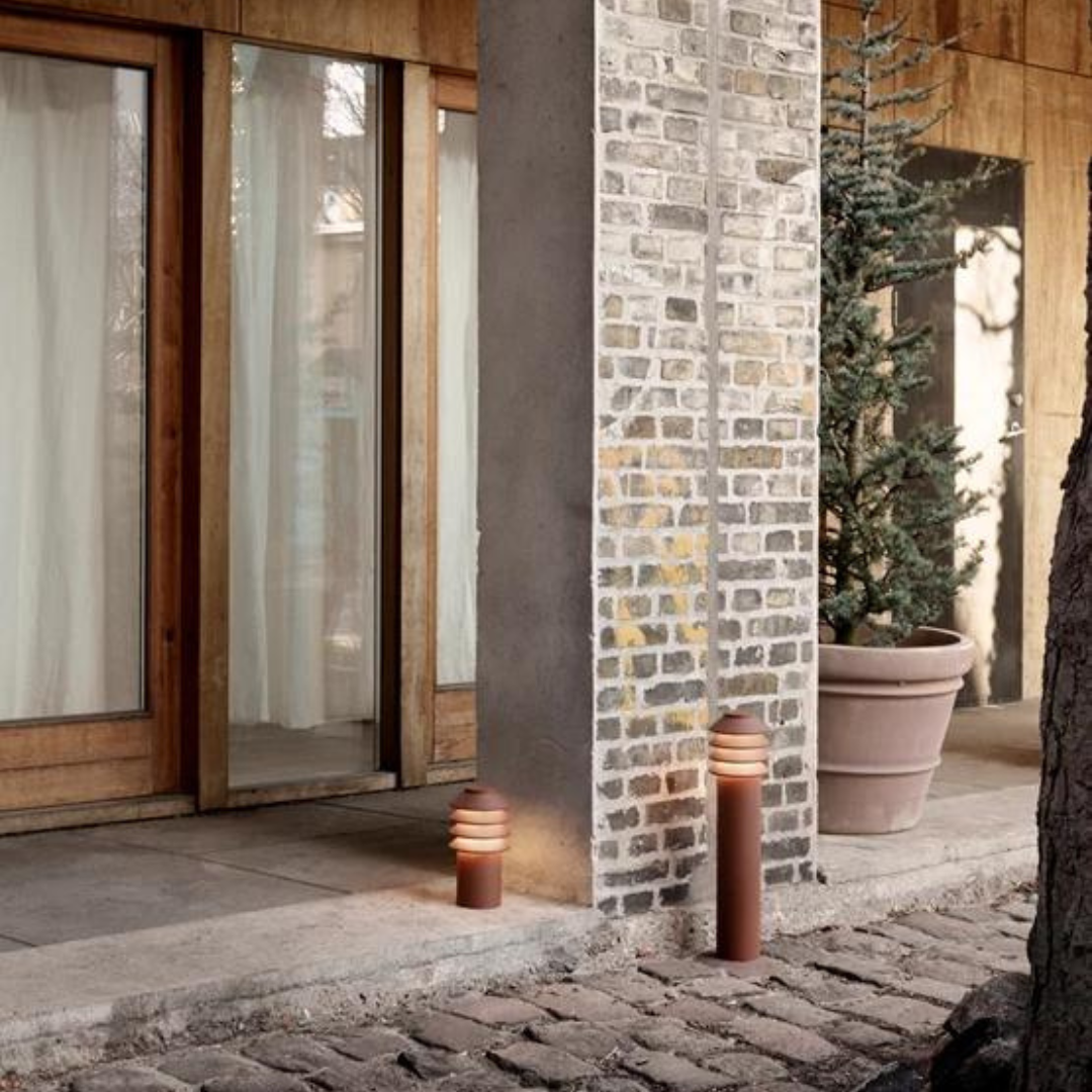 Bysted Garden LED Short Bollard is a downscaled version of Danish architect Peter Bysted's original 1975 design. The bollard is characterized by its four rings and the intriguing soft/diffused/ambient symmetric light pattern it creates on the ground.