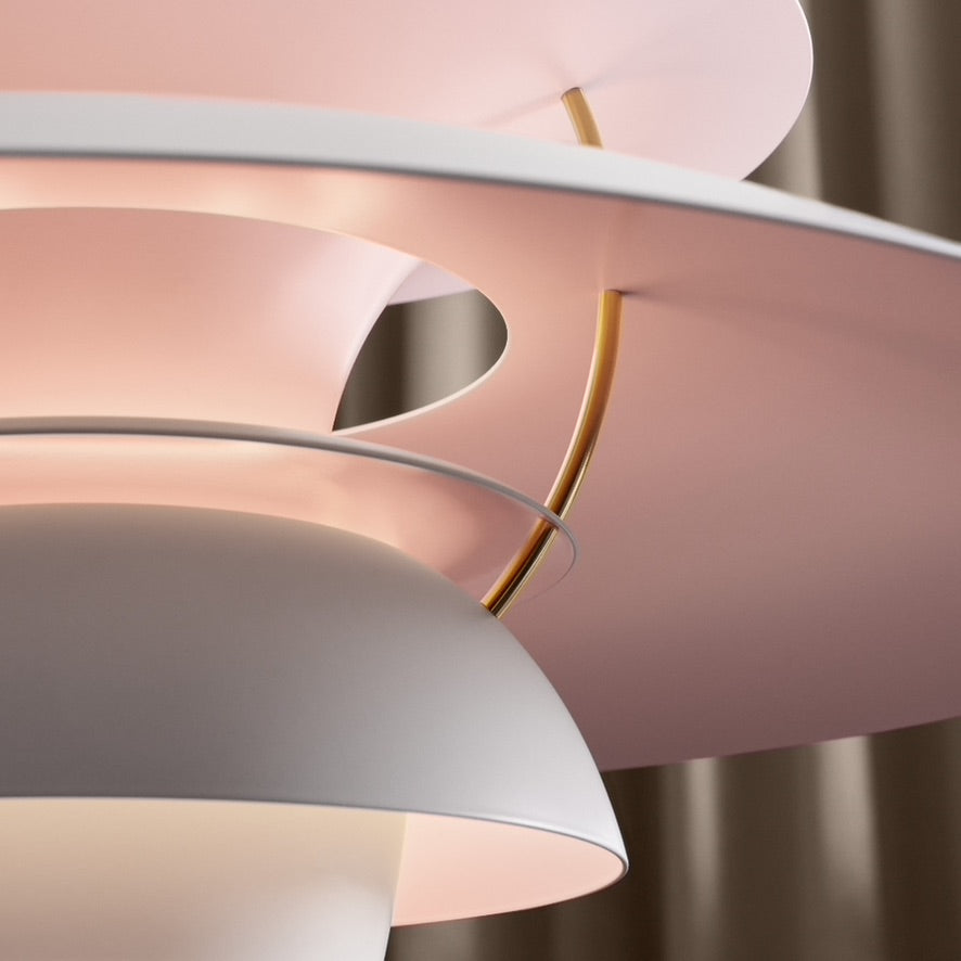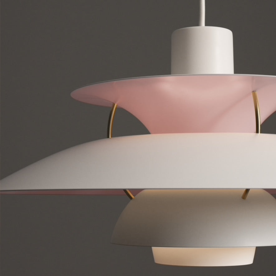 The PH 5 Pendant Light - 150th Anniversary from Louis Poulsen marks a significant milestone by modernizing the classic Poul Henningsen design. This limited edition commemorates Louis Poulsen’s 150th anniversary with a refined version of the original 1958 fixture. It features a layered PH shade system made of spun aluminum dishes, supported by brass-finished rods, and a Pale Rose inner finish within its Matte White shades. The design has been slightly updated to accommodate modern lighting technology, ensuring glare-free illumination and enhancing any space with its timeless elegance.