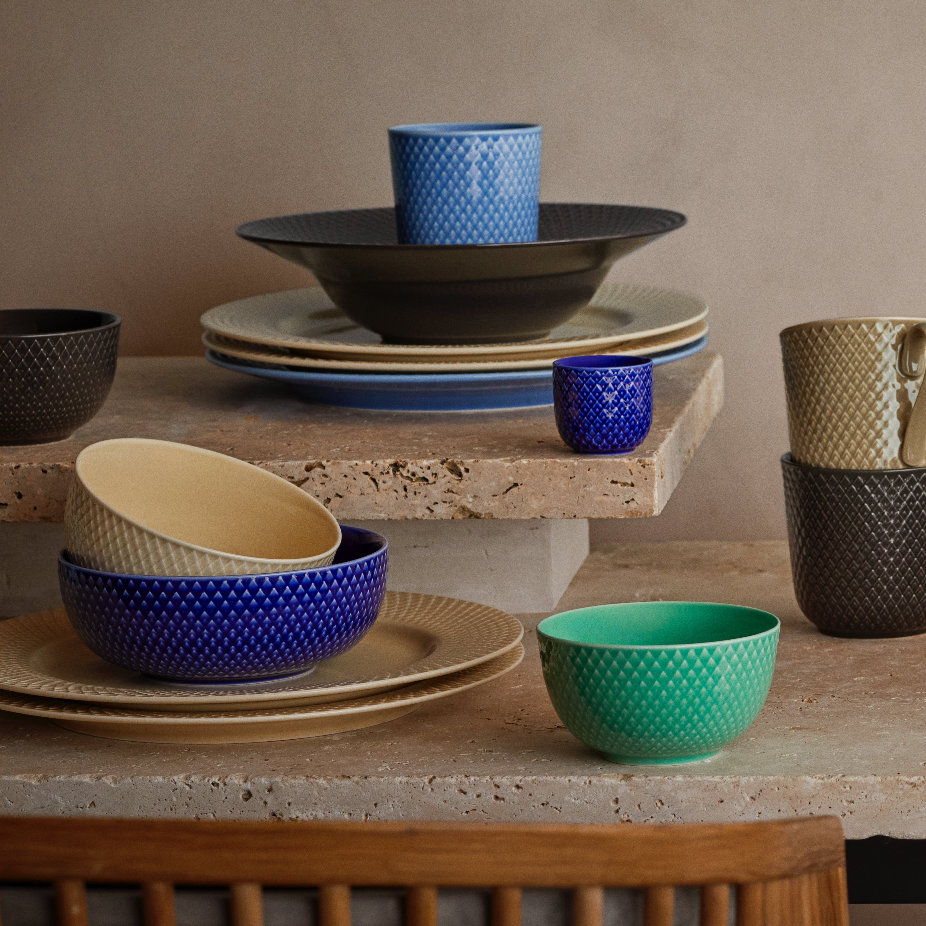 The Lyngby Porcelain Rhombe Color bowl in dark blue, inspired by the midnight sky, is both versatile and elegant. Measuring 6.1 inches in diameter and 2.4 inches in height, it’s perfect for serving soups, salads, pasta, desserts, or breakfast items like yogurt and muesli. The tactile Rhombe pattern stands out against its glossy finish. Its shallow shape invites casual, cozy dining while maintaining Lyngby’s signature sleek design, ideal for both table settings and relaxed moments on the sofa.