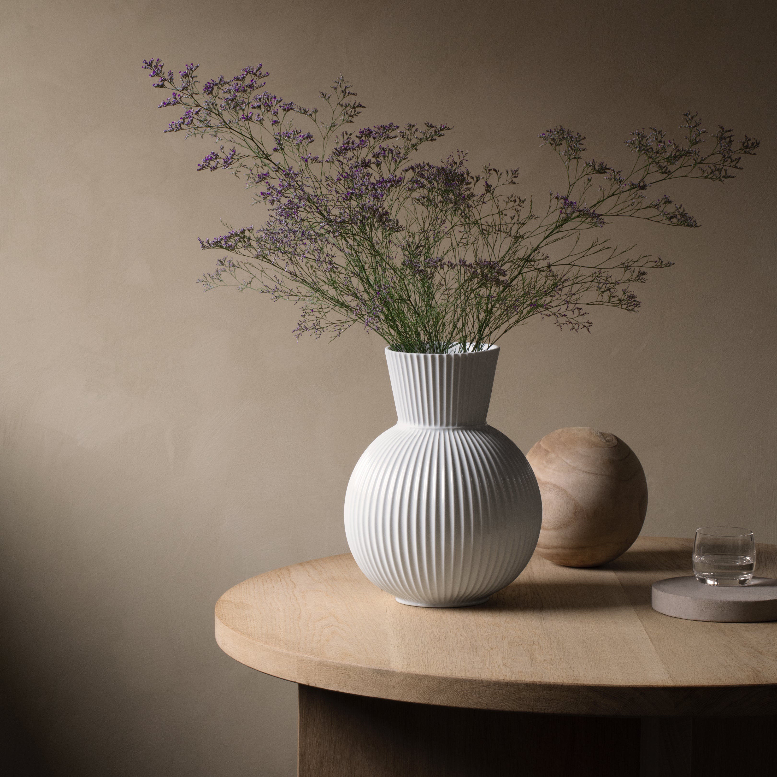 The exquisite Lyngby Porcelain Tura Vase 34, crafted from chalk-white porcelain by designer Philip Bro Ludvigsen, draws inspiration from feminine forms. Embracing Lyngby Porcelain’s signature grooves, the Tura vase presents a contemporary interpretation of timeless beauty.