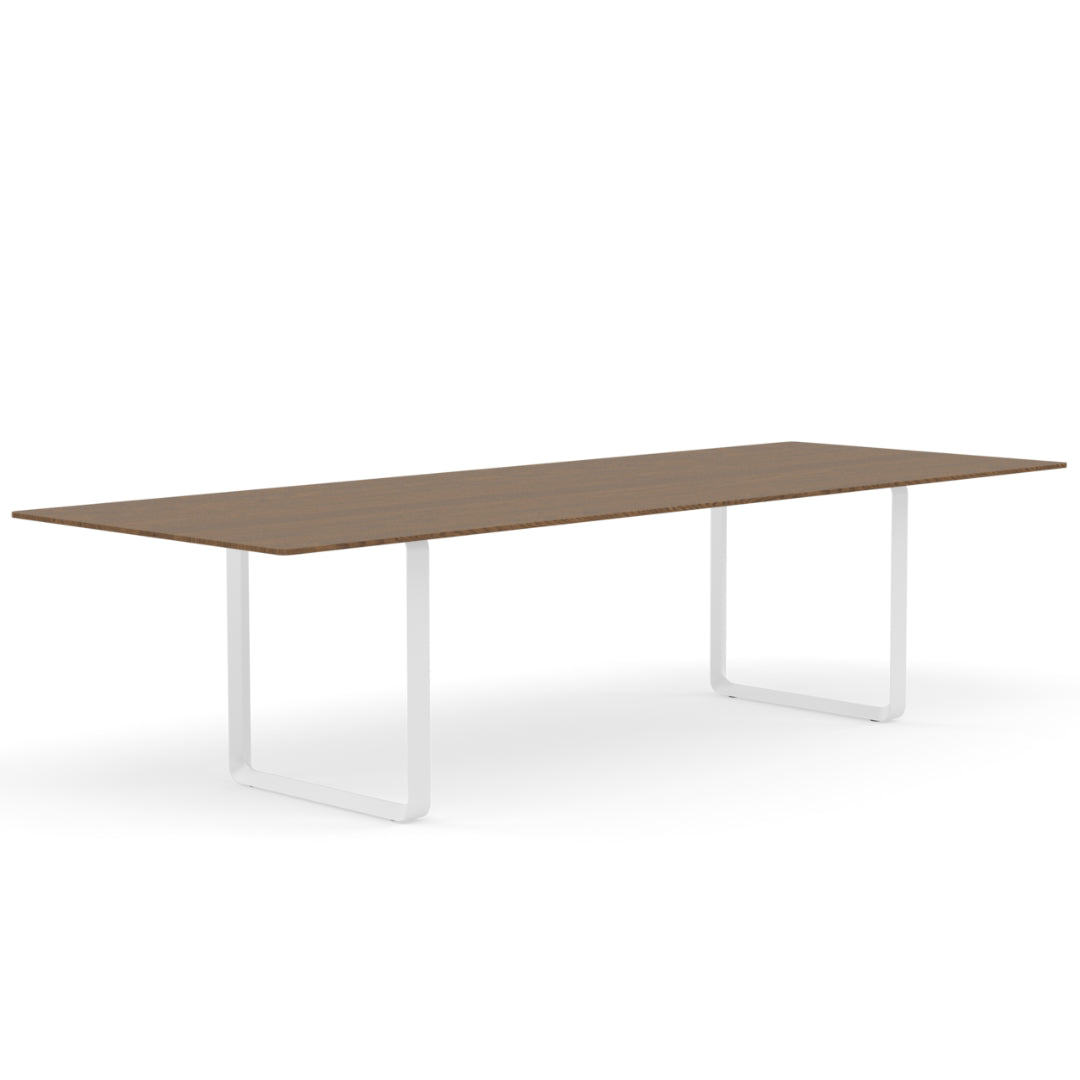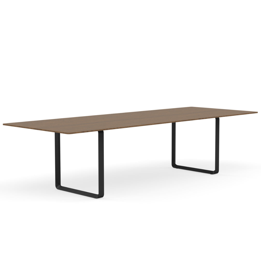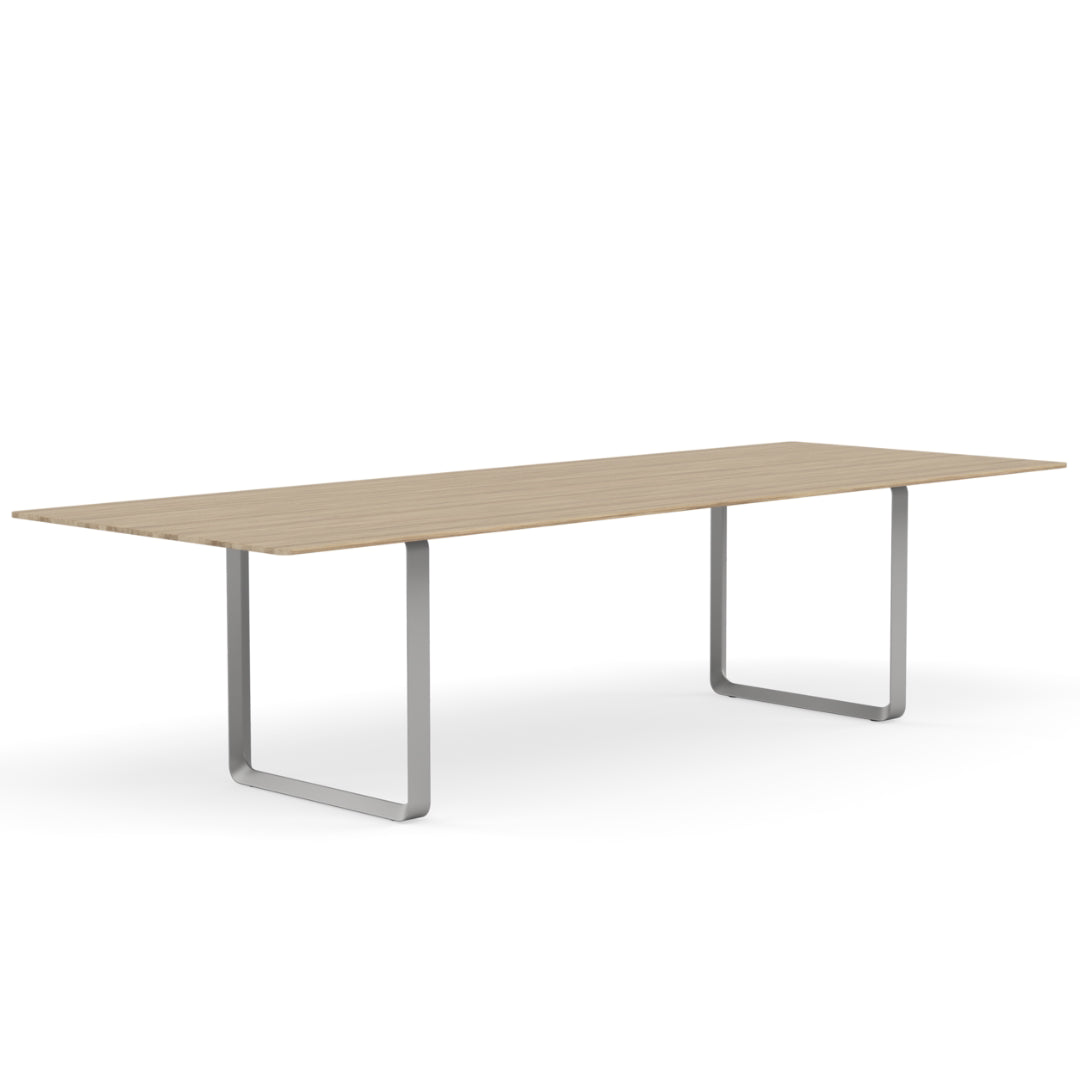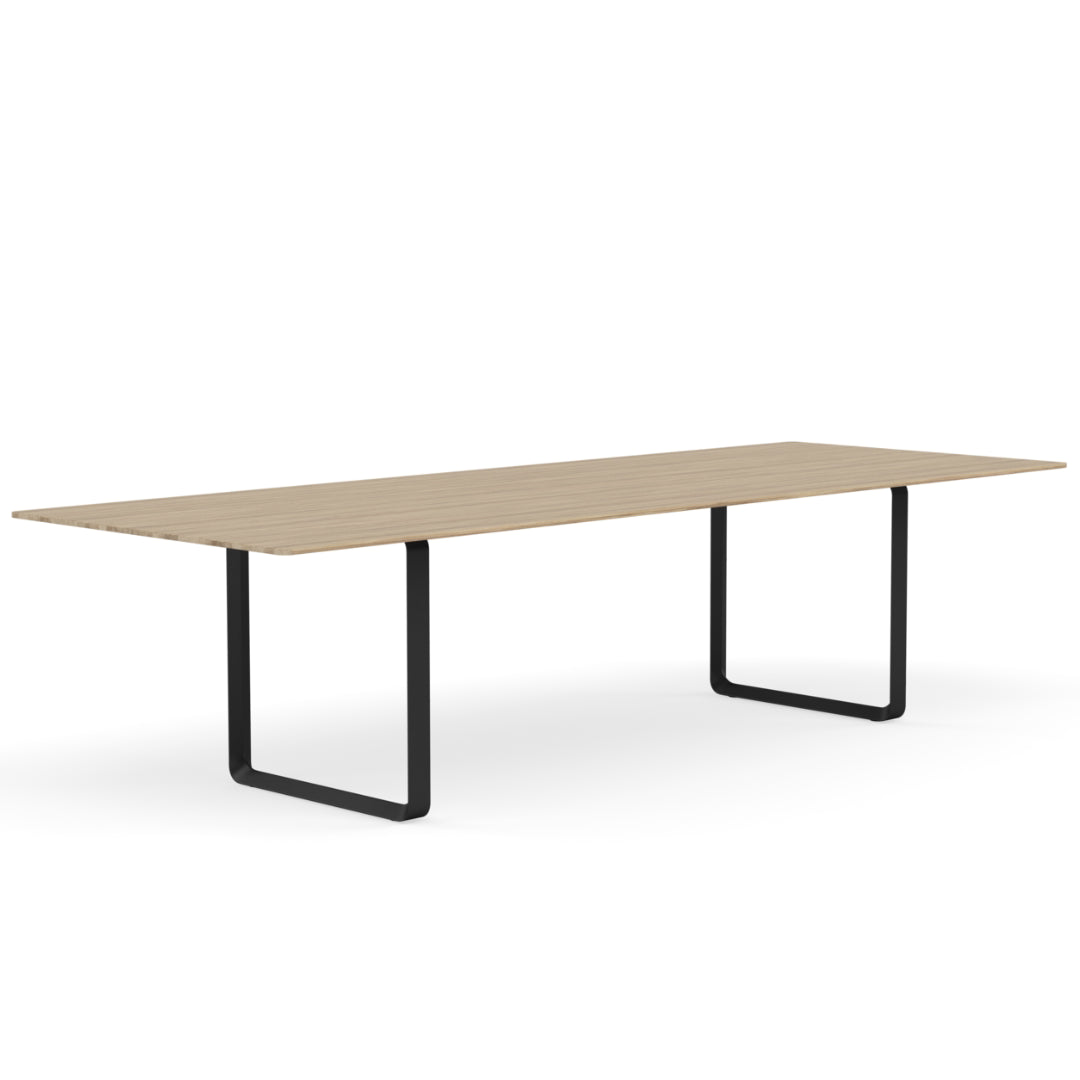 The MUUTO 70/70 Table is available in a variety of colors, sizes and finishes. Black, White and Grey frames are made of cast aluminum. Black and Grey table tops are a linoleum surface that is finished with a lacquered oak veneer and the white table tops are made from plywood with a laminate surface and lacquered oak veneer.