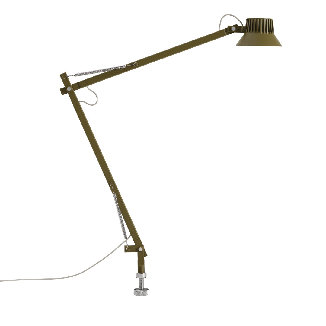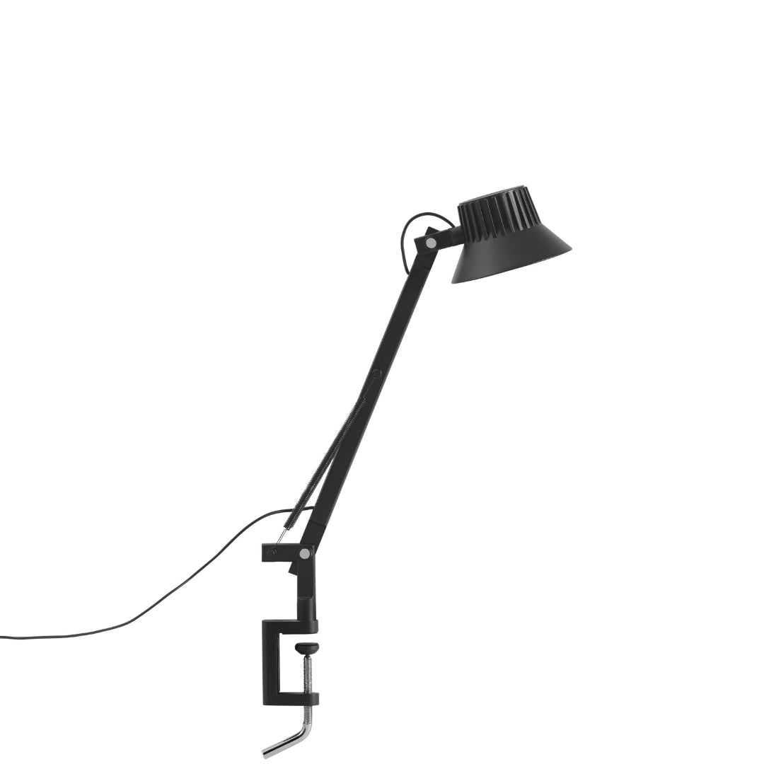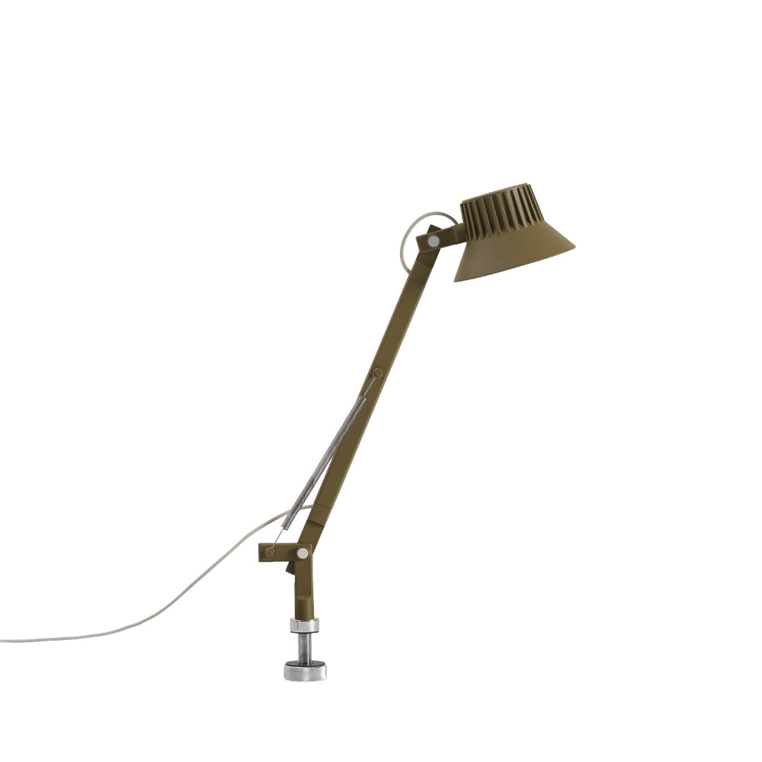 Material: The lamp head and hinges are in die-casted aluminum, and the lamp arms are in extruded aluminum. All powder coated.Table base in machined steel. Clamp in die-casted aluminum and screw in stainless steel. Pin in machined steel screw and fixing nut.