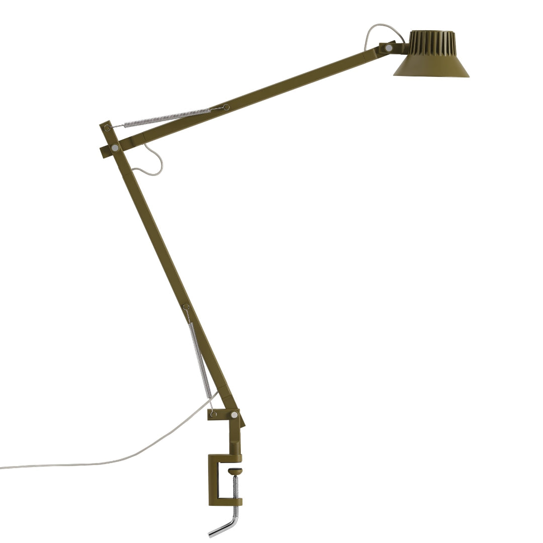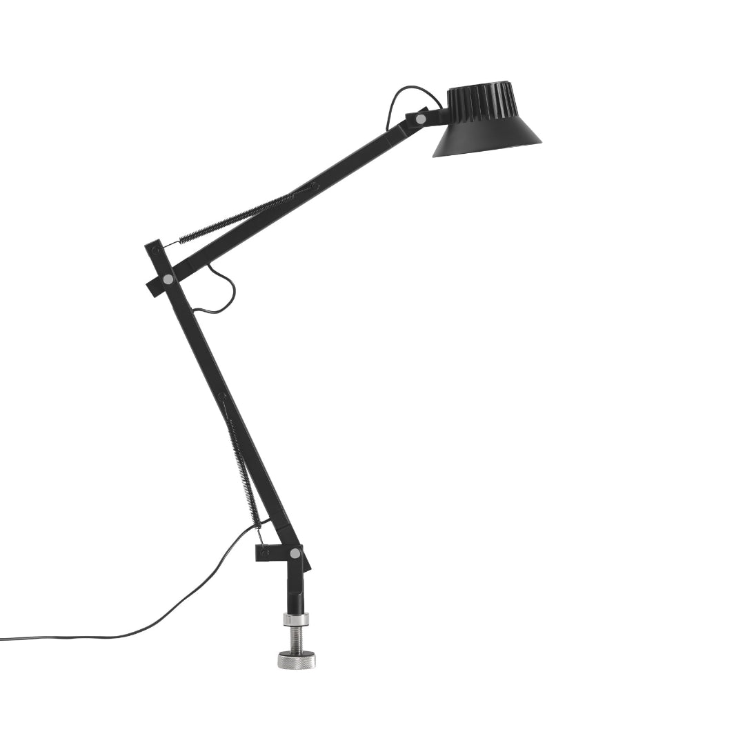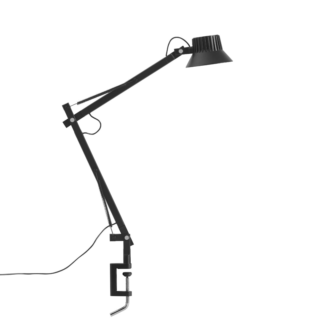 Material: The lamp head and hinges are in die-casted aluminum, and the lamp arms are in extruded aluminum. All powder coated.Table base in machined steel. Clamp in die-casted aluminum and screw in stainless steel. Pin in machined steel screw and fixing nut.