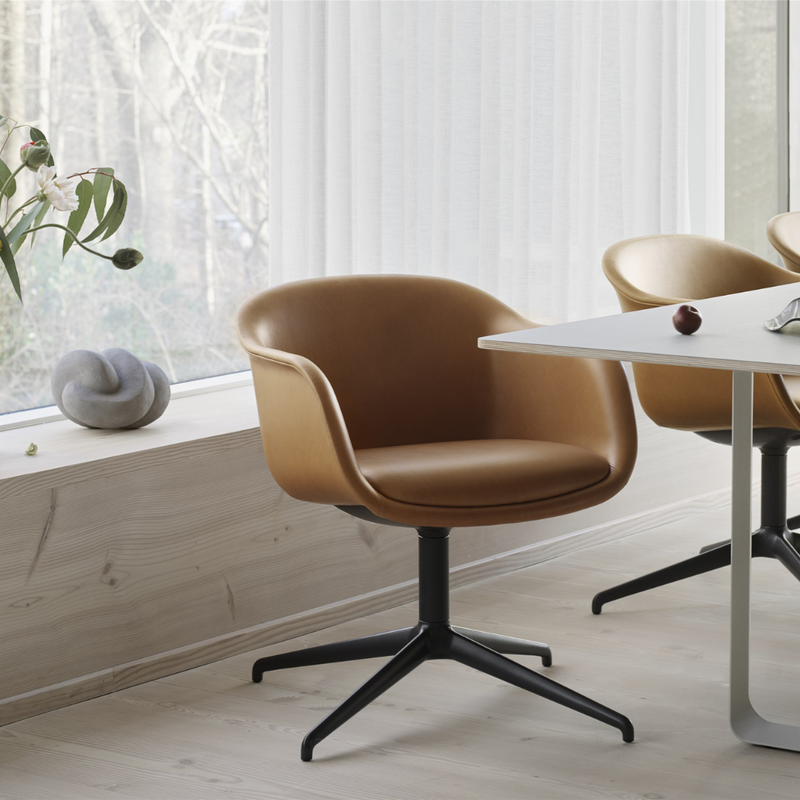 A sculptural yet distinctly ergonomic seat makes the Fiber Conference Armchair with Swivel Base ideal anywhere we spend an extended time seated. Its interior shell is made of 99% recycled plastic, while its spacious seat and embracing curves are fully upholstered with a soft fixed cushion, providing maximum comfort in public spaces and the home alike.