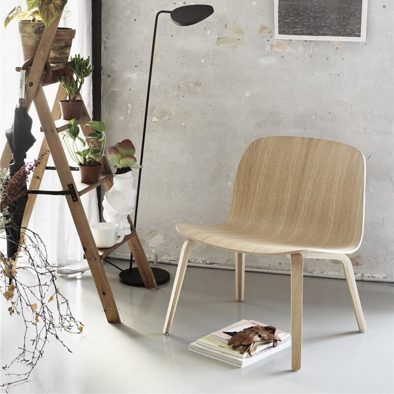 We love the cool curves and low profile of the Visu Lounge Chair styled in the living room or as a seating area in a master or guest bedroom. The MUUTO Visu Lounge Chair is currently available in 2 different veneer color options, including oak and black as well as a grey upholstered option.
