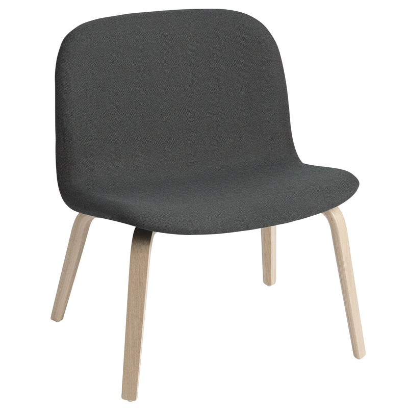 The Visu Lounge Chair in oak and black have a veneer shell and base topped with a water-based lacquer. The upholstered variation has a shell of veneer topped that's upholstered with high quality fabric.