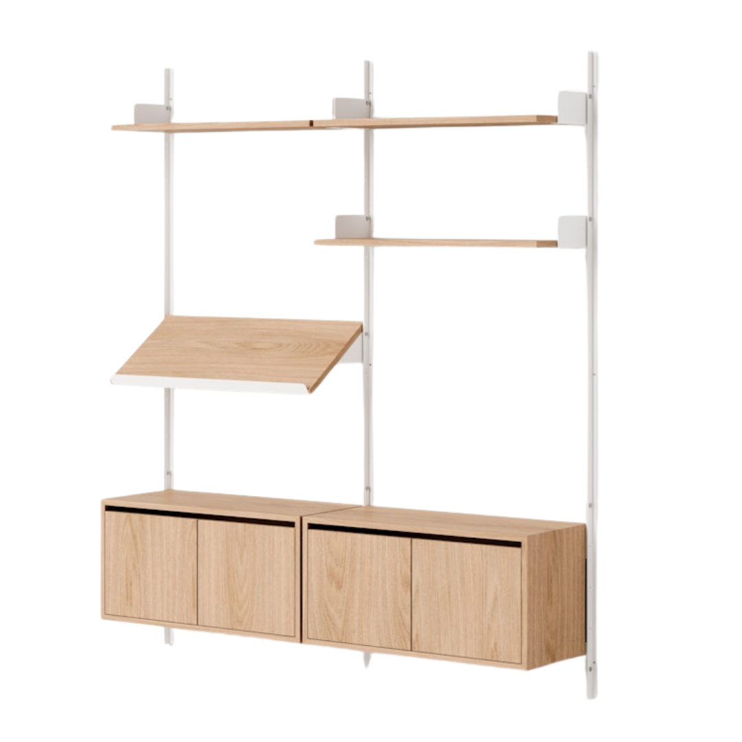 Living Shelf Cabinets Low with Doors includes 2 x NW Wall Bar, 1900 (Set of 2), 3 x NW Standard Shelf, 3 x NW Standard Shelf Support, 1 x NW Magazine Shelf, 1 x NW Magazine Shelf Support, t 2 x NW Cabinet Low w. Doors, 2 x Cabinet Support.