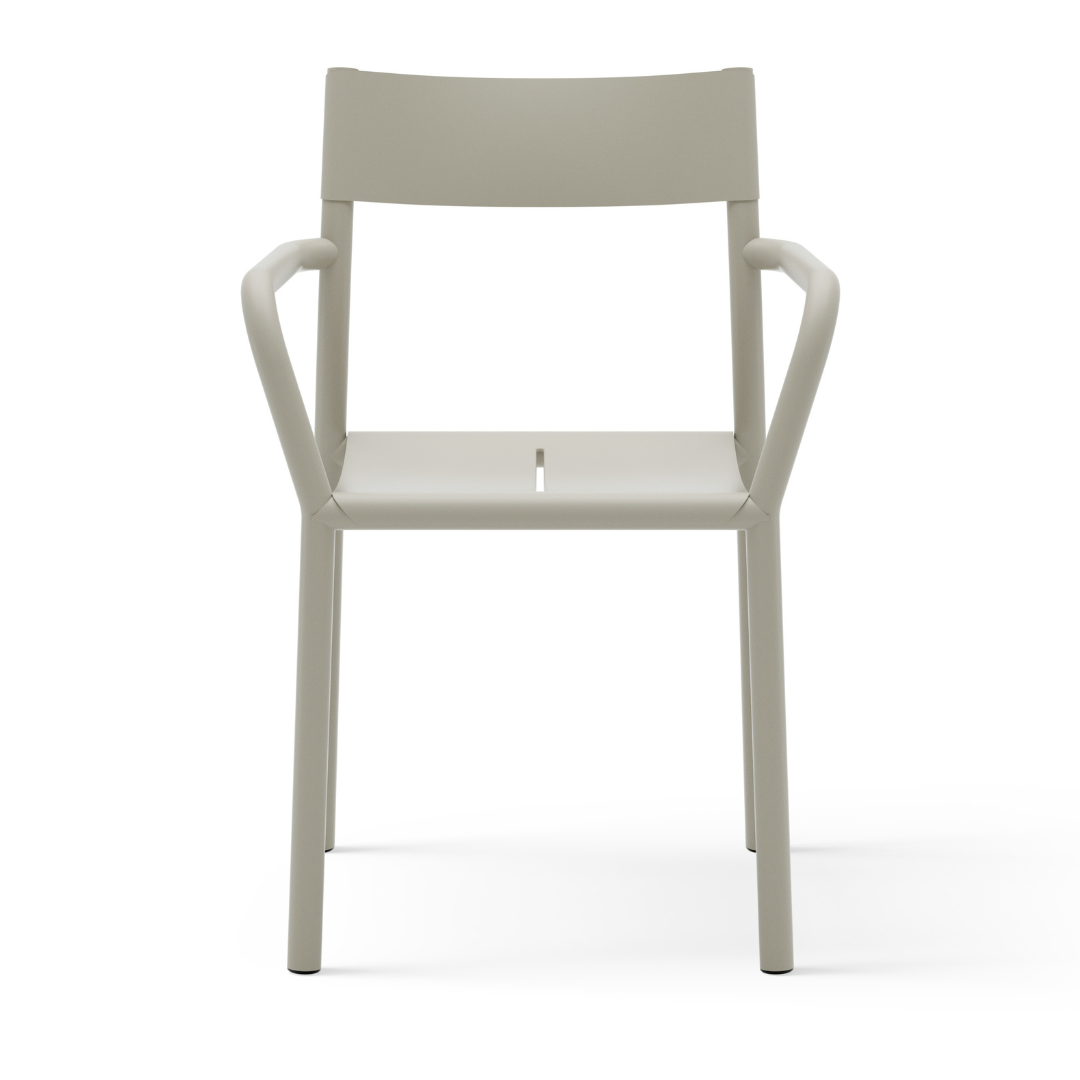 The May Outdoor Chair's delicate surface harmoniously integrates with a robust frame, creating a balanced interplay of contrasting elements. The lightweight steel sheet gracefully envelops the sturdy frame, resulting in a resilient yet comfortable seat that is subtly contoured to embrace the body. A discreet slit in the seat not only facilitates water drainage, but adds a touch of visual interest to the otherwise uniform surface. Echoed in the design of the tables, this motif creates a sense of cohesion and rhythm, imbuing the entire collection with a sense of airiness and unity.