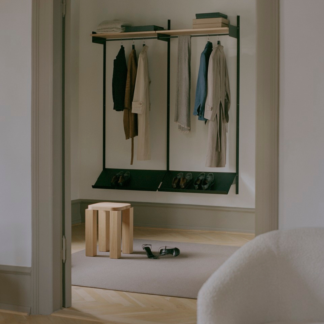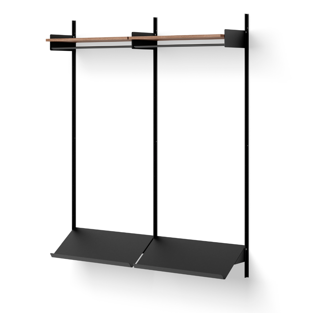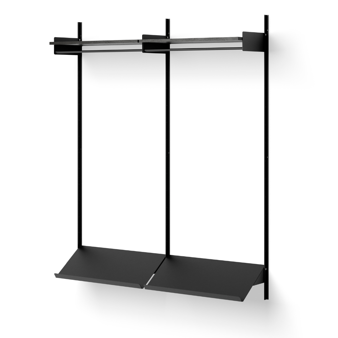 The New Works Wardrobe Shelf 2 1900 is a wall shelf configuration from the New Works Shelving System. Packed with understated details yet also stripped down to the bare essentials, this flexible shelving system effortlessly blends into a variety of spaces. Notice the angular profiles of the wall bars and the integrated bookends that keep things in place. The shelves are attached with flat knurled stainless steel screws that give an honest yet refined look. The New Works Shelving System is meant to grow with you as your needs evolve.