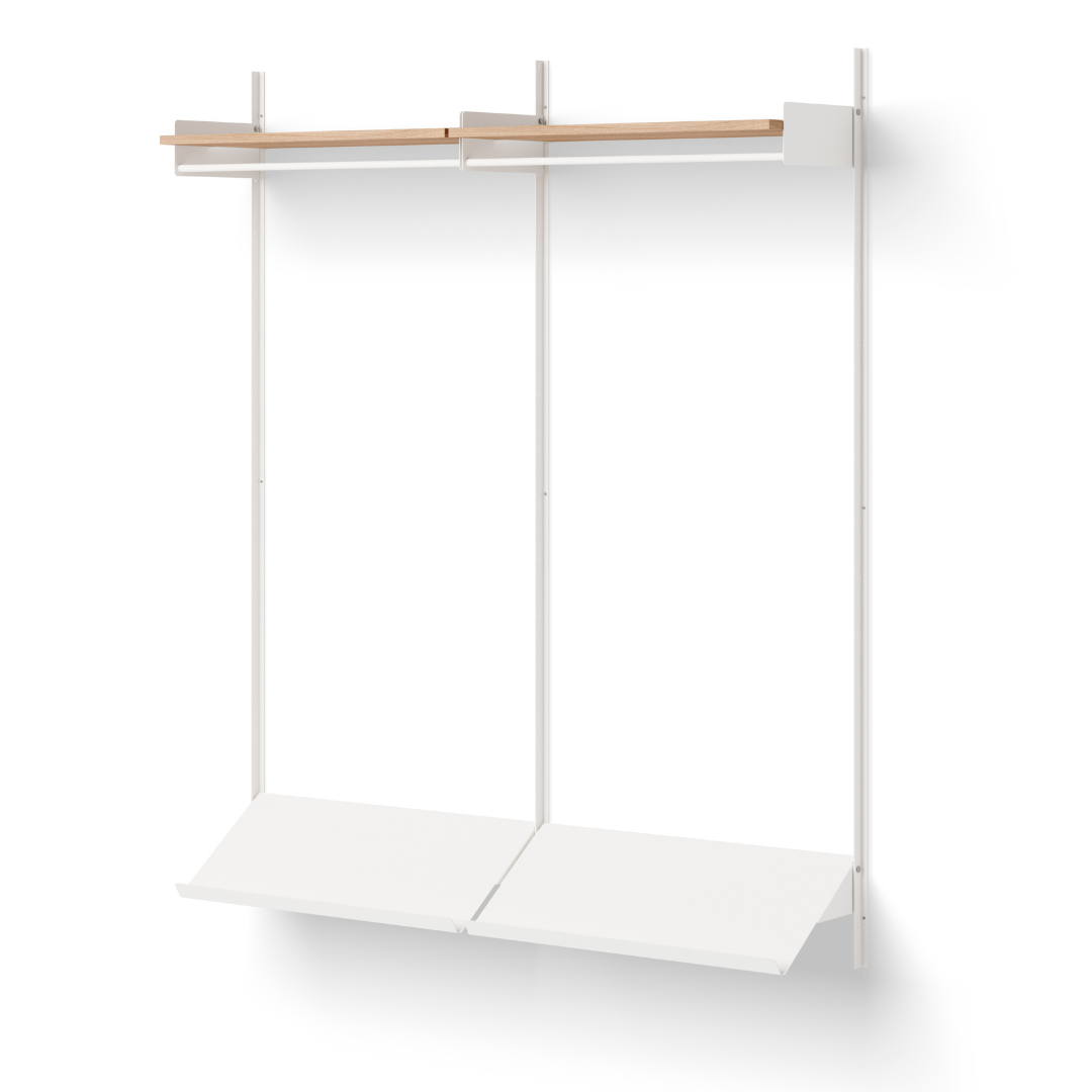 Wardrobe Shelf 2 1900 includes 2 x NW Wall Bar, 1900 (Set of 2), 2 x NW Deep Shelf, 2 x NW Deep Shelf Support, 2 x NW Slanted Shelf.