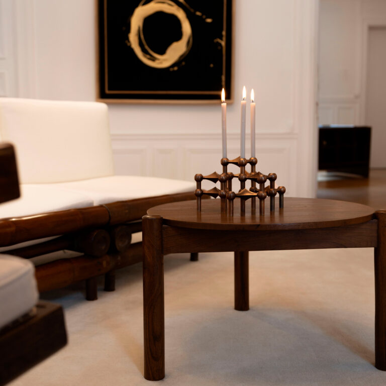 This candle holder, made from solid brass and oxidized for a bronzed finish, is left untreated to allow for natural patination over time. To remove candle drips, place the holder in hot water with a drop of detergent. Avoid polishing it afterwards, as this will damage the bronzed finish. Be aware that repeated stacking may cause marks on the legs, revealing the clean brass surface beneath due to natural wear and tear.