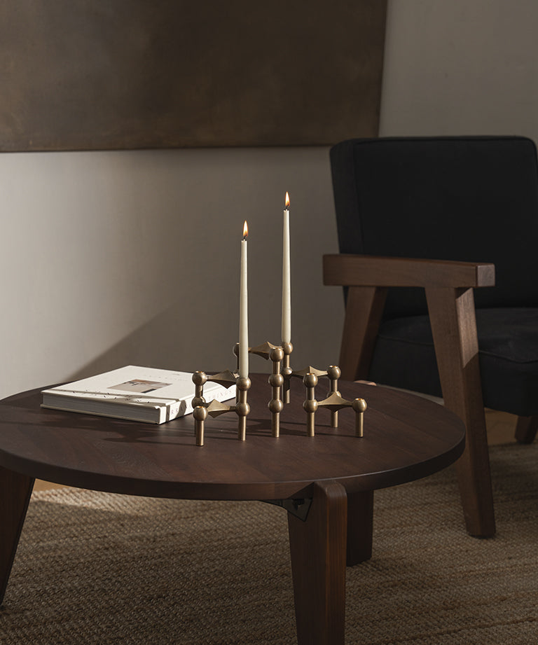 The three holes are polished to reveal a pristine brass surface, enhancing its artistic appeal. It serves as both a personal statement and a versatile sculpture, ready to be shaped by its owner's creativity. You can combine it with other STOFF Nagel designs and use it with taper candles, or simply display it as a decorative piece.
