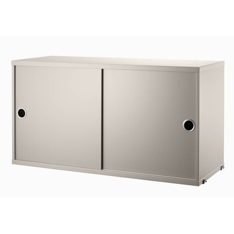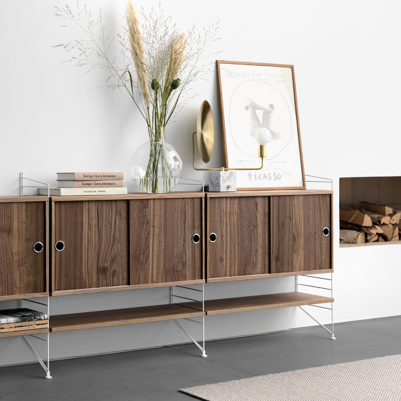 The String Cabinets with Sliding Doors fit into all wire and plex panels from the String System. Add a cabinet for loads of extra storage that boldly contrasts the rest of your system. Each cabinet features one divider in the middle along with two adjustable inner shelves. The inner dimensions are 1.6" less than the outer dimensions. We love using this element to create a sideboard in a living room.