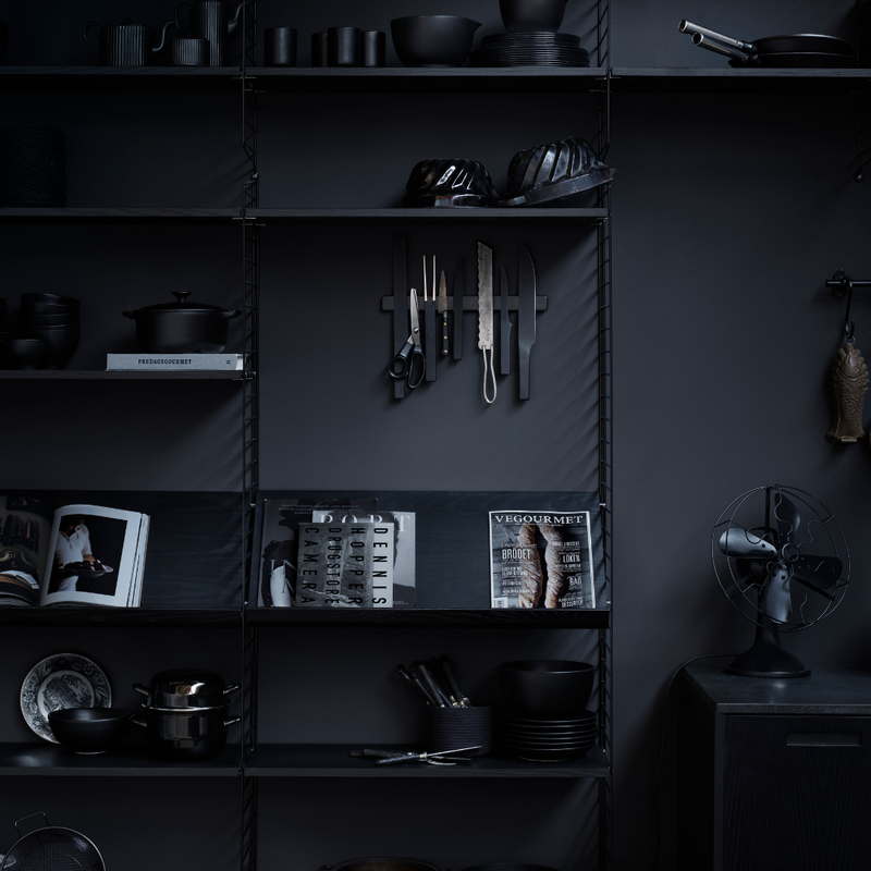 The String System is a Scandinavian shelving system designed to make all your storage problems go away. Build the storage system of your dreams by designing your own unique combination, mixing metal shelves, wooden shelves, and colorful elements––the possibilities are endless.