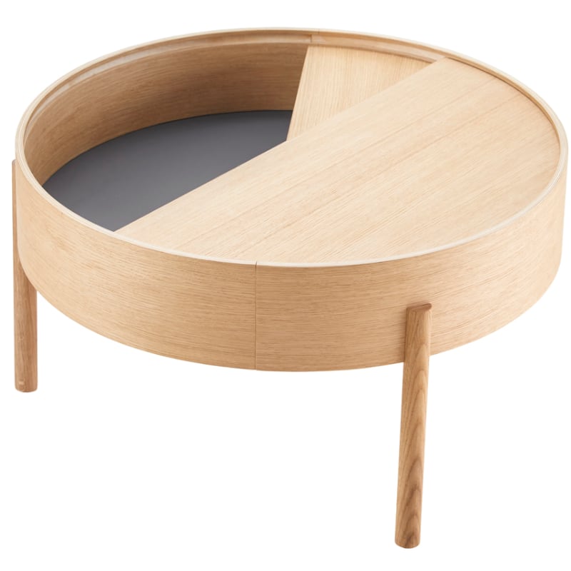 The WOUD Arc Coffee Table takes its name from the mathematical concept of a smooth curve joining two points in a circle. The ARC table invites its user to make use of the simple functionalities, use one finger to turn the upper tabletop. Let it be open with your favorite objects on display or close the lid to conceal contents. The surface on the inside storage space is covered with a smooth nano-laminate to complement the wood wood while the three-legged construction adds a playful and light touch to the geometric shaped design.