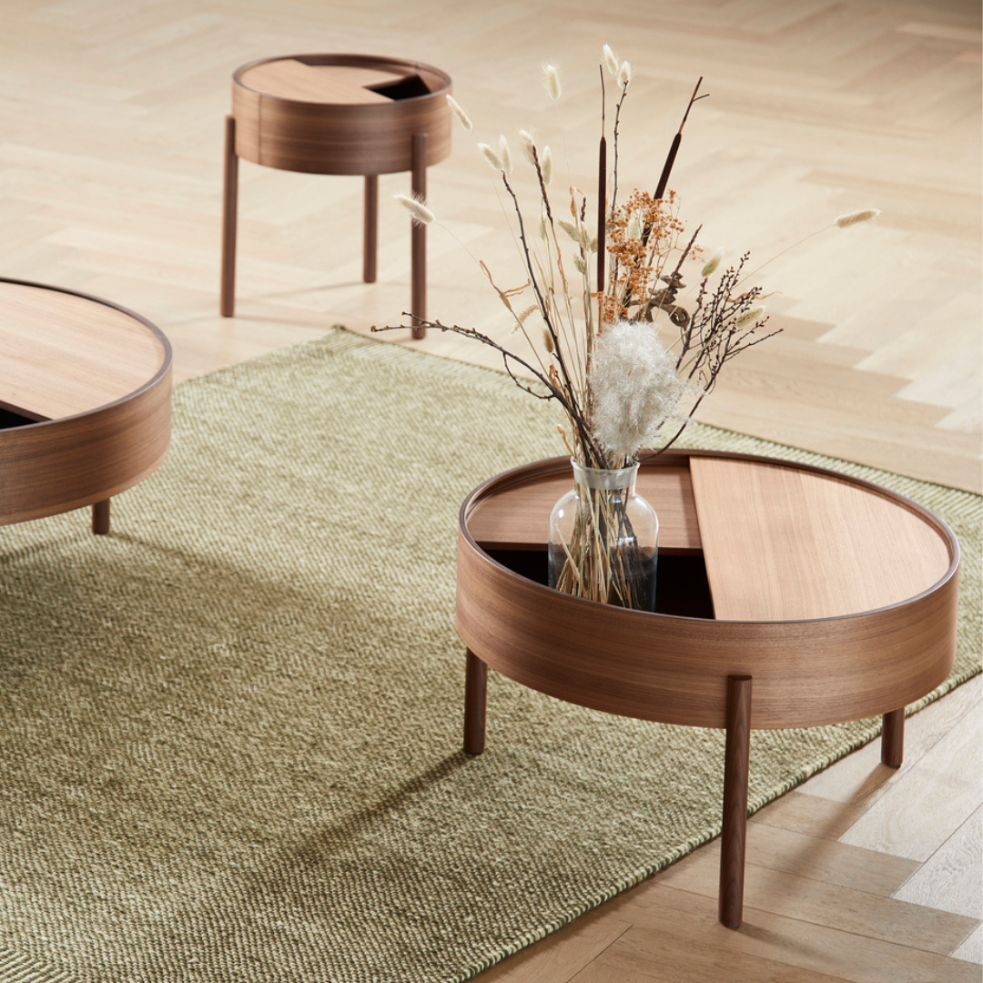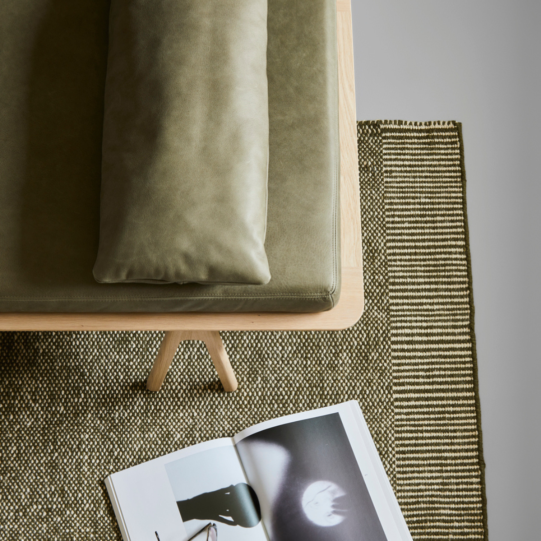 The Rombo Rug comes in three sizes in Grey, Moss Green, and Off-White/Brown.