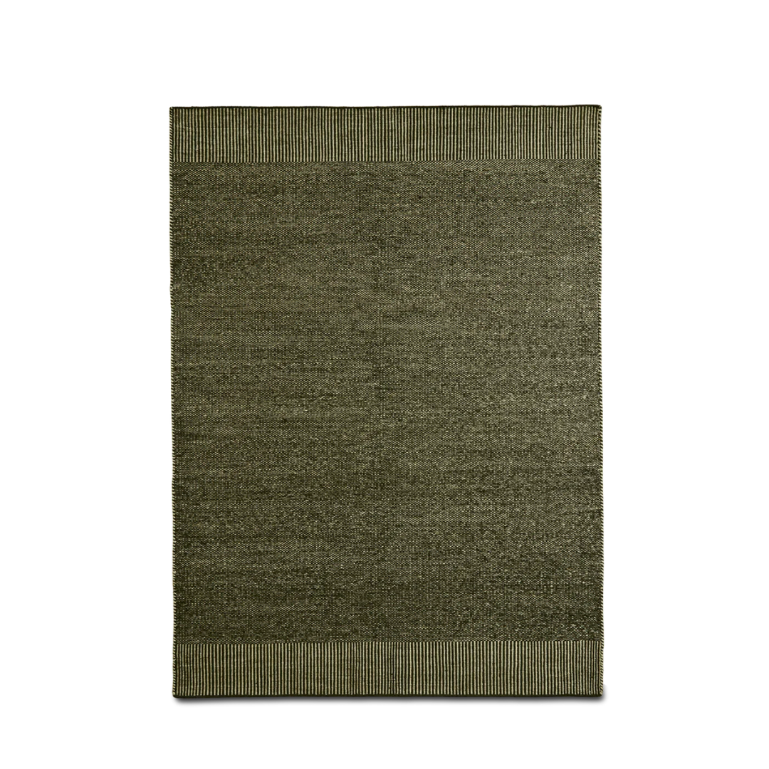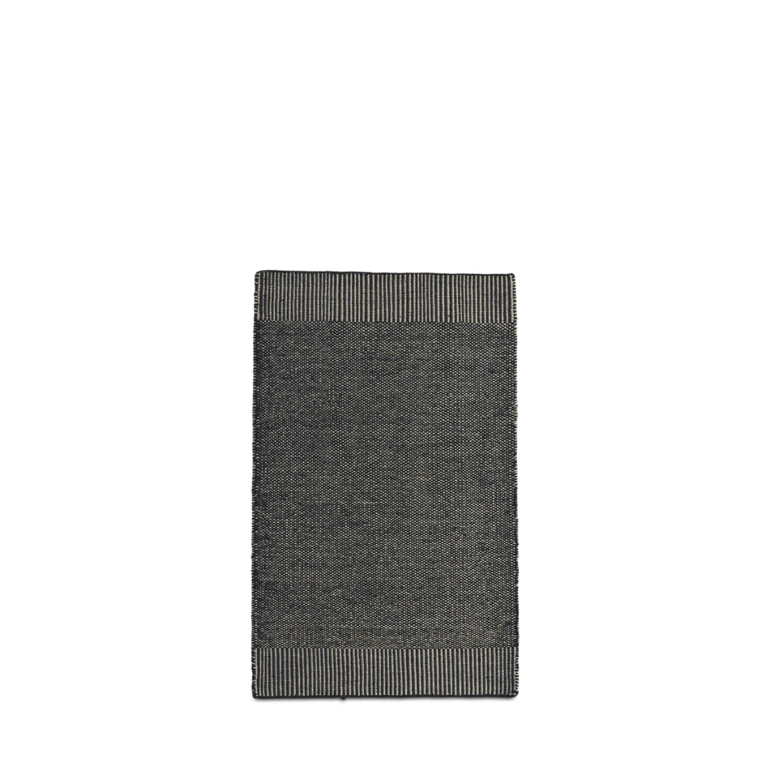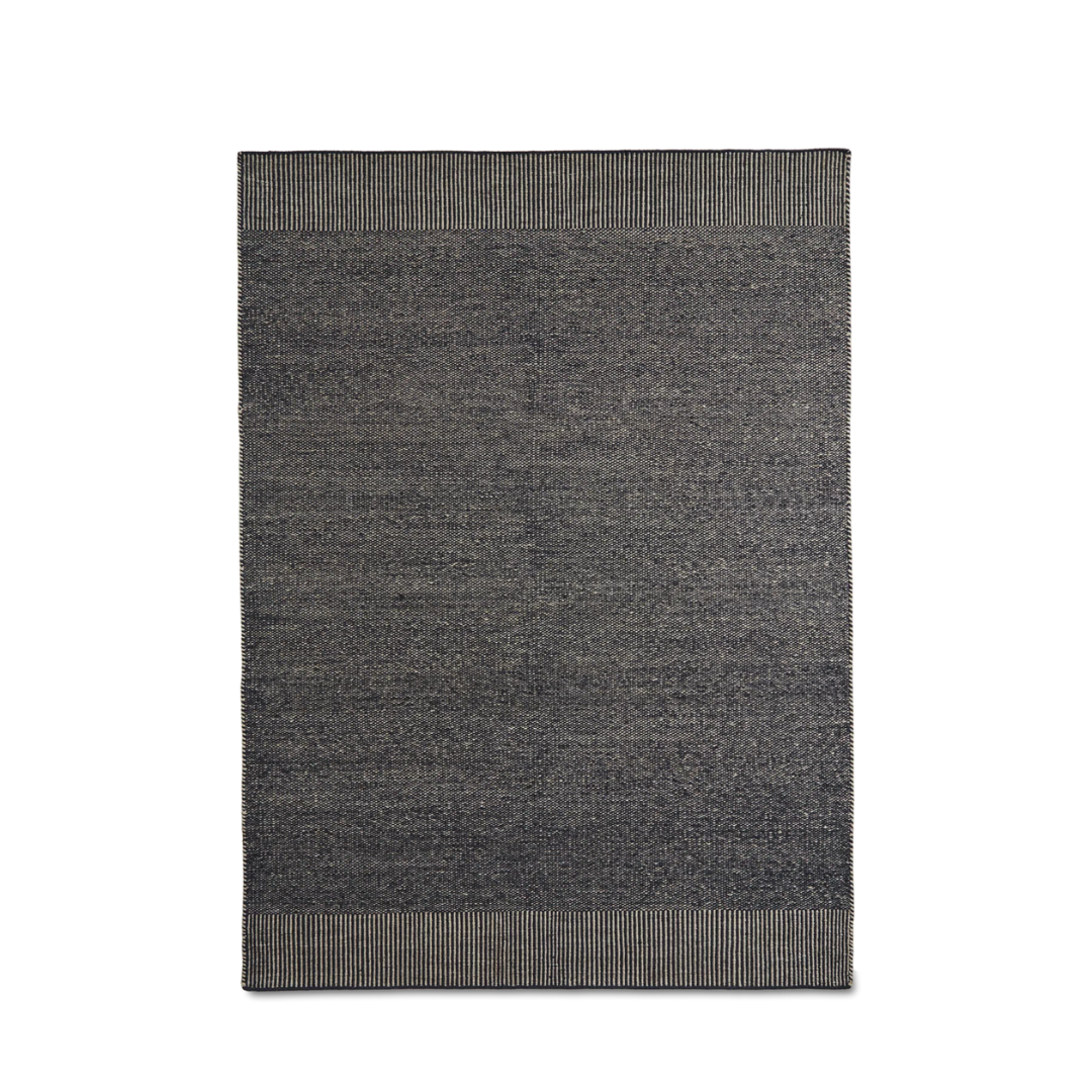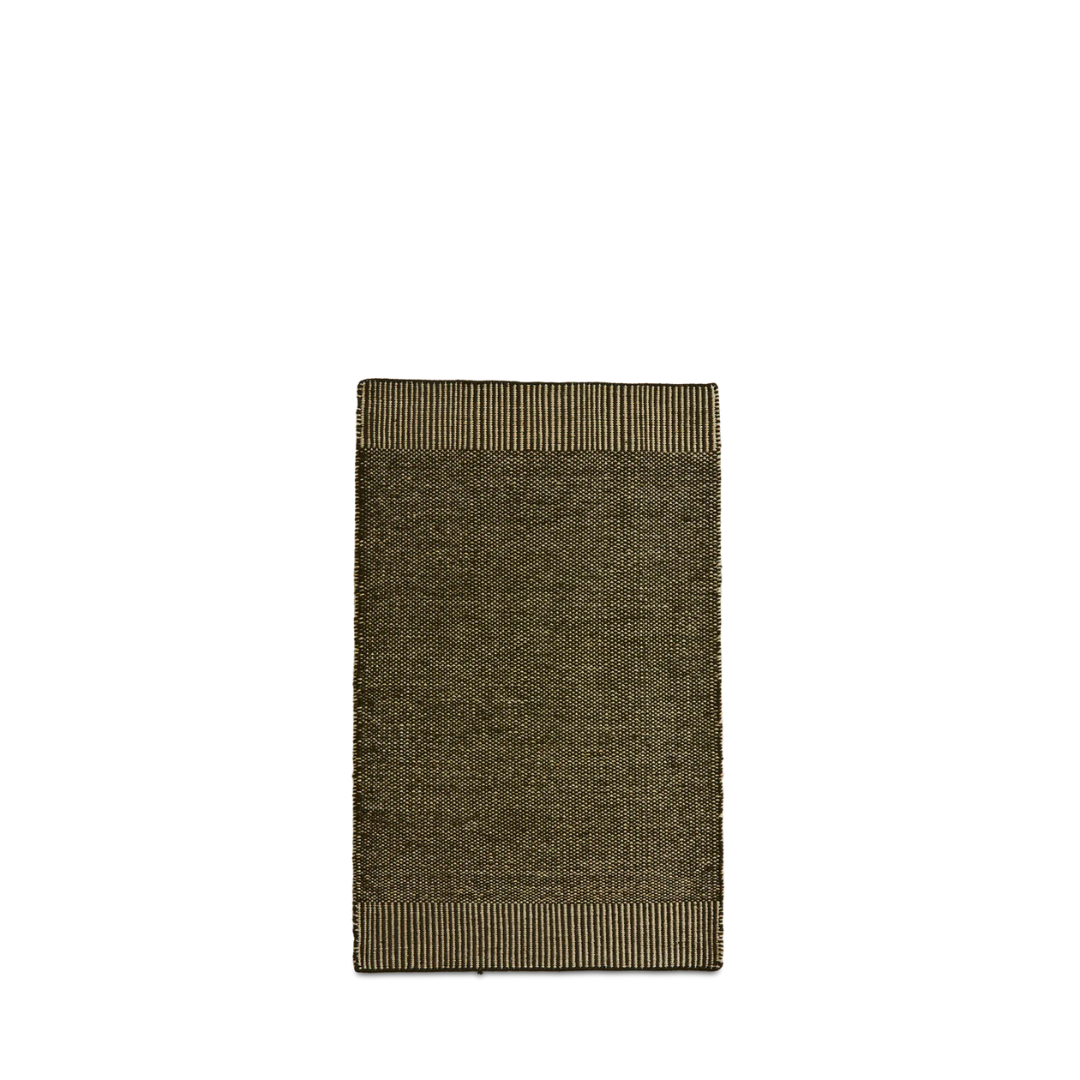 Rombo is characterized by the combination of wool and jute materials, which creates a robust surface. The woven construction forms small, distinctive rhombi patterns, which inspired the series name. Each end of the rug is encased by straight lines that create an elegant contrast between the colors and patterns.
