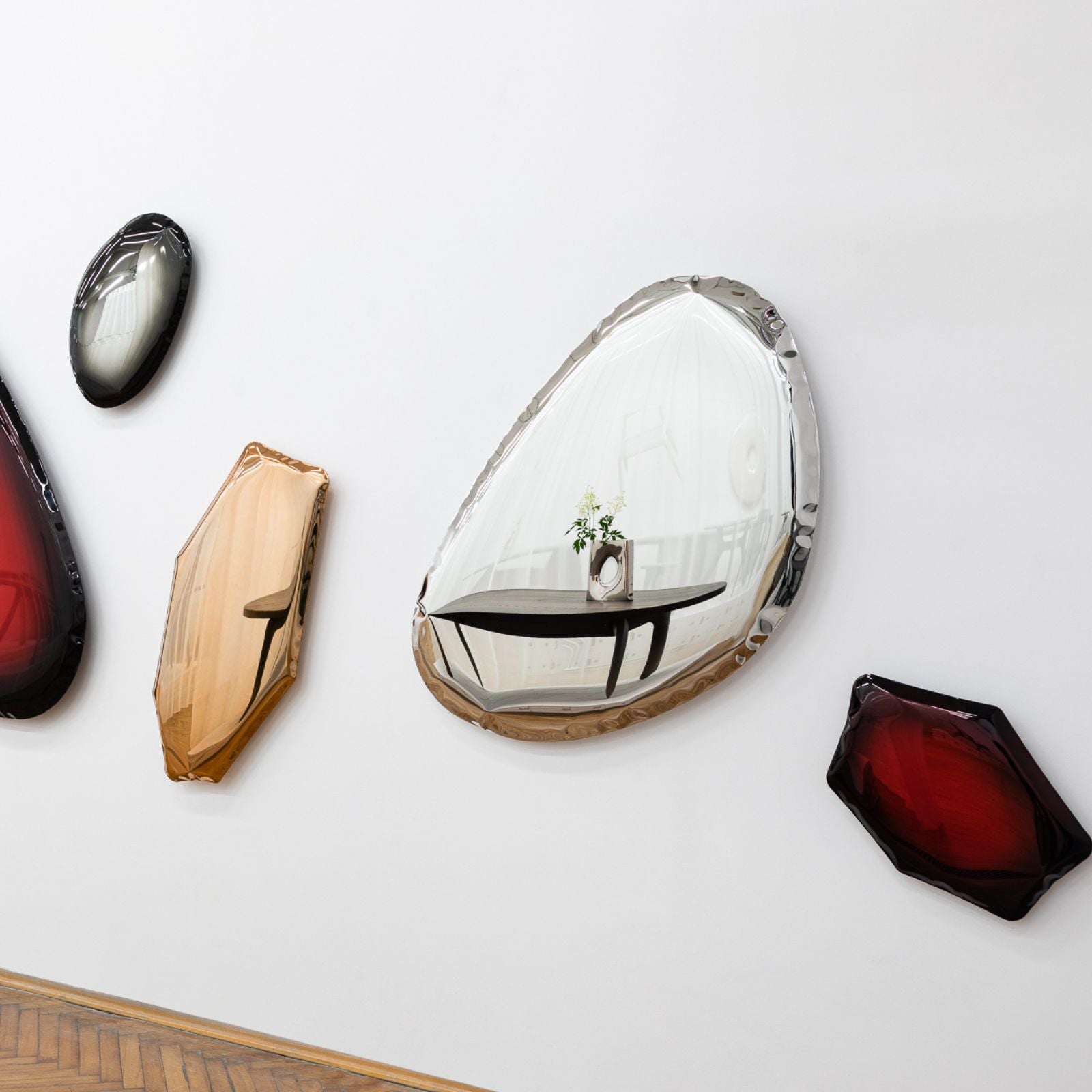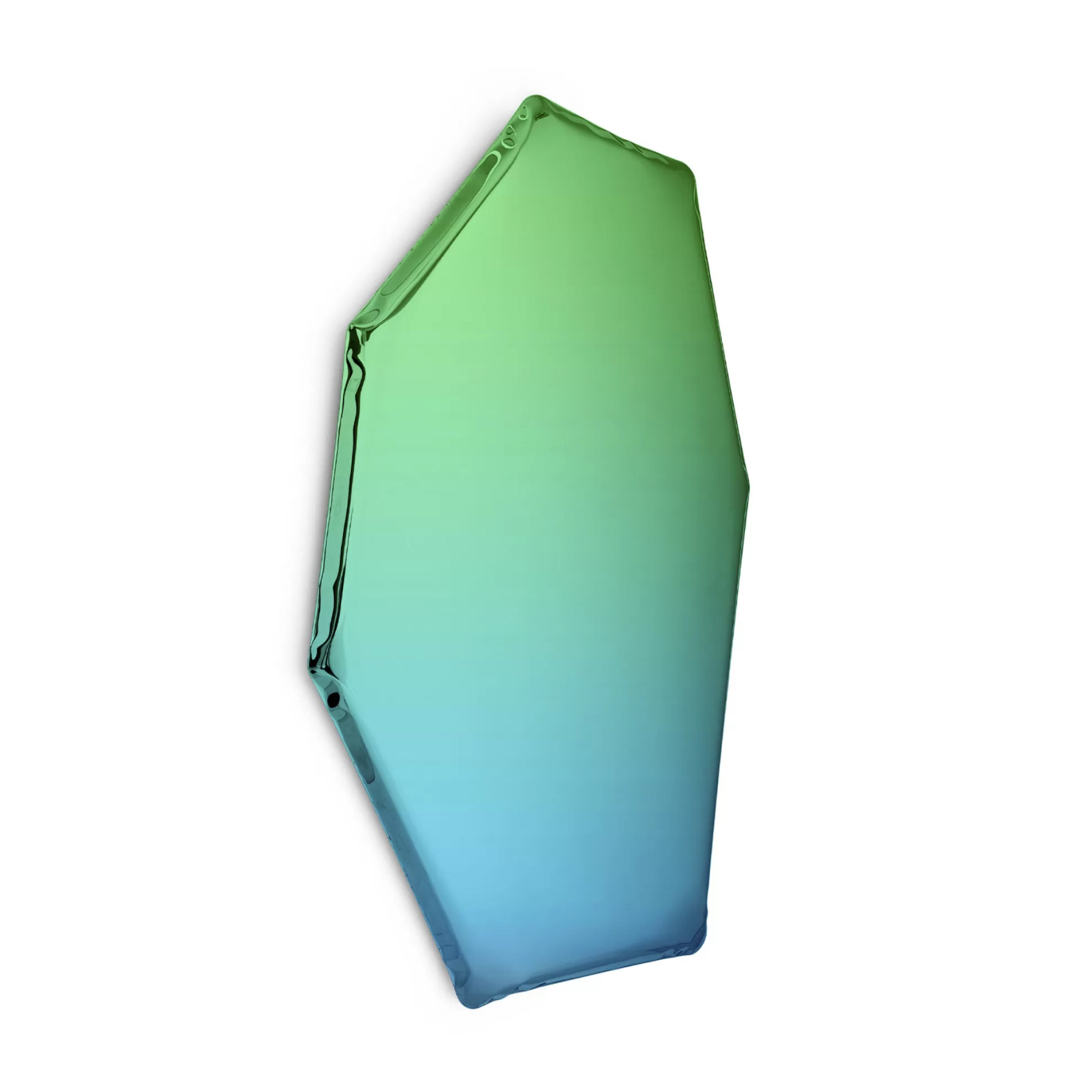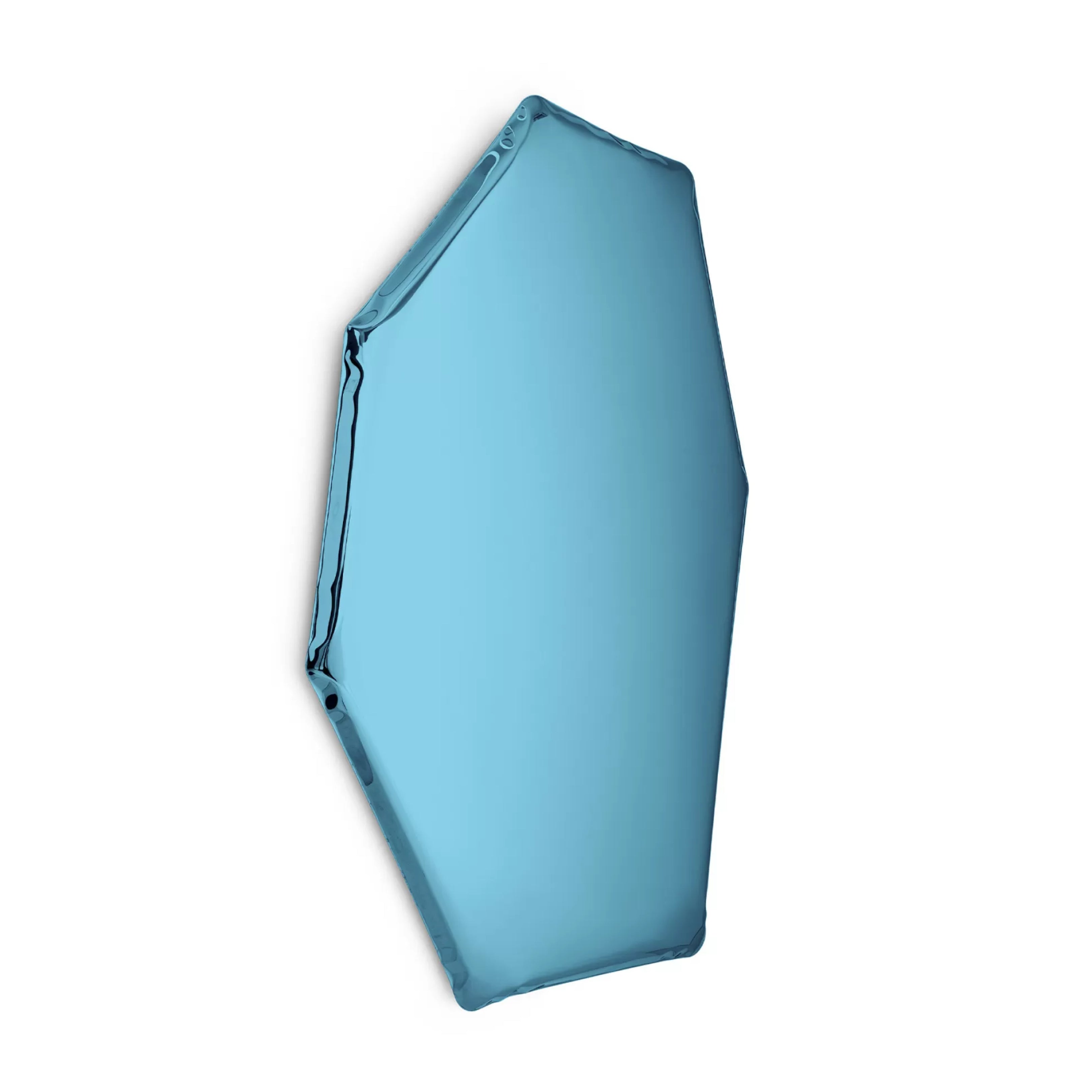 Zieta Studio’s TAFLA C2 Mirror reimagines the shape of a water droplet in polished steel. Formed using FiDU technology, where air pressure sculpts two thin steel sheets. Each piece features organic, one-of-a-kind curves. Its fluid, sculptural form captures light and reflection in dynamic ways, whether mounted on a wall or placed freestanding.