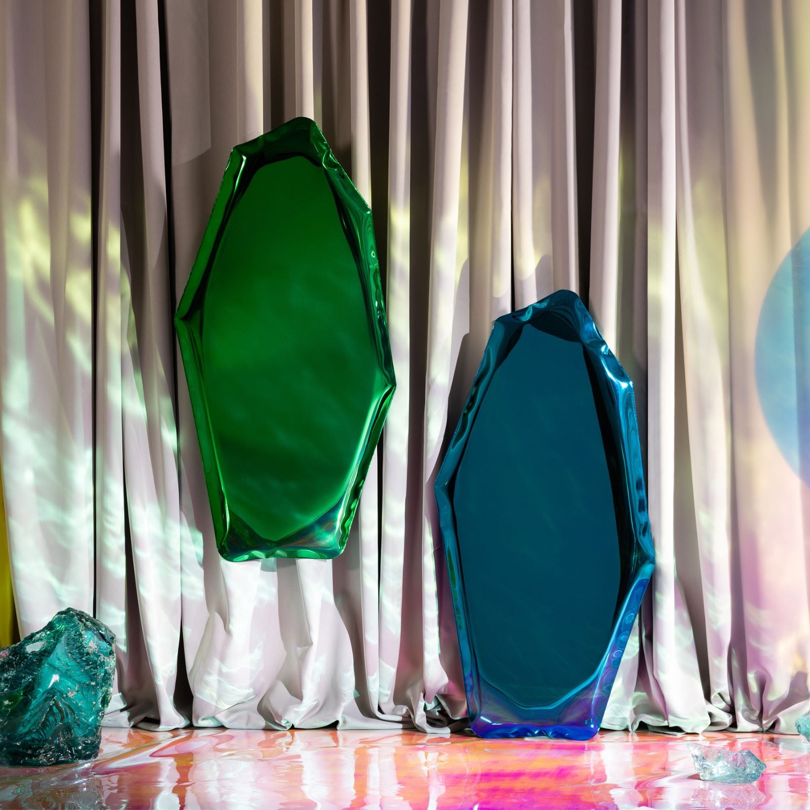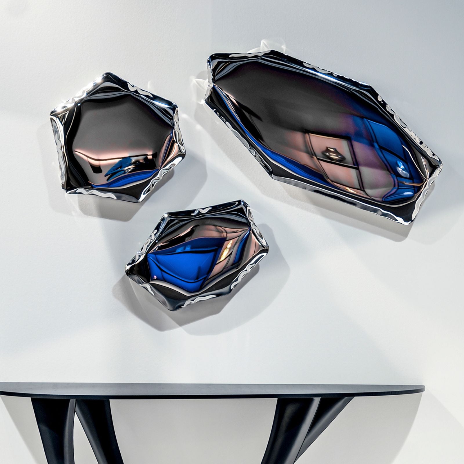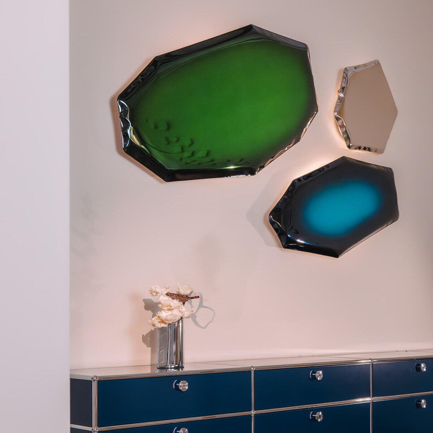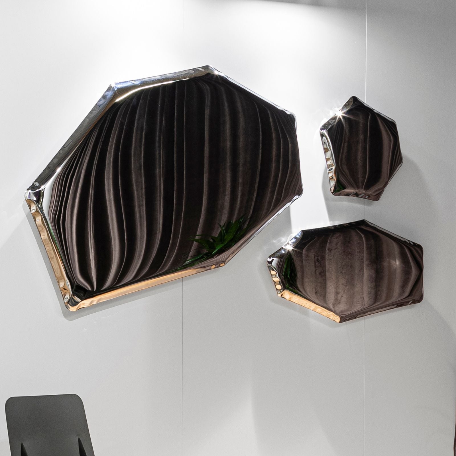 Zieta Studio’s TAFLA C2 Mirror reimagines the shape of a water droplet in polished steel. Formed using FiDU technology, where air pressure sculpts two thin steel sheets. Each piece features organic, one-of-a-kind curves. Its fluid, sculptural form captures light and reflection in dynamic ways, whether mounted on a wall or placed freestanding.