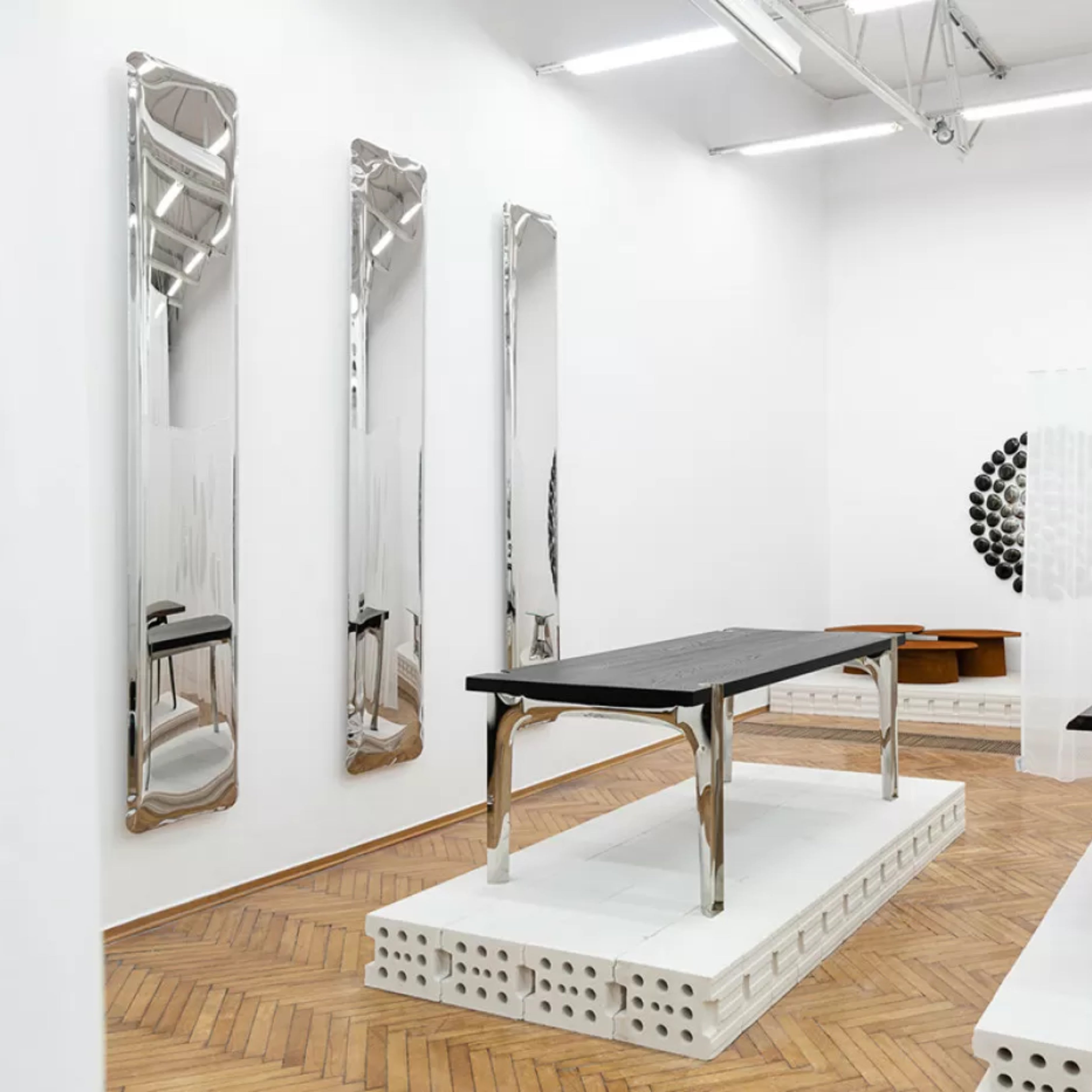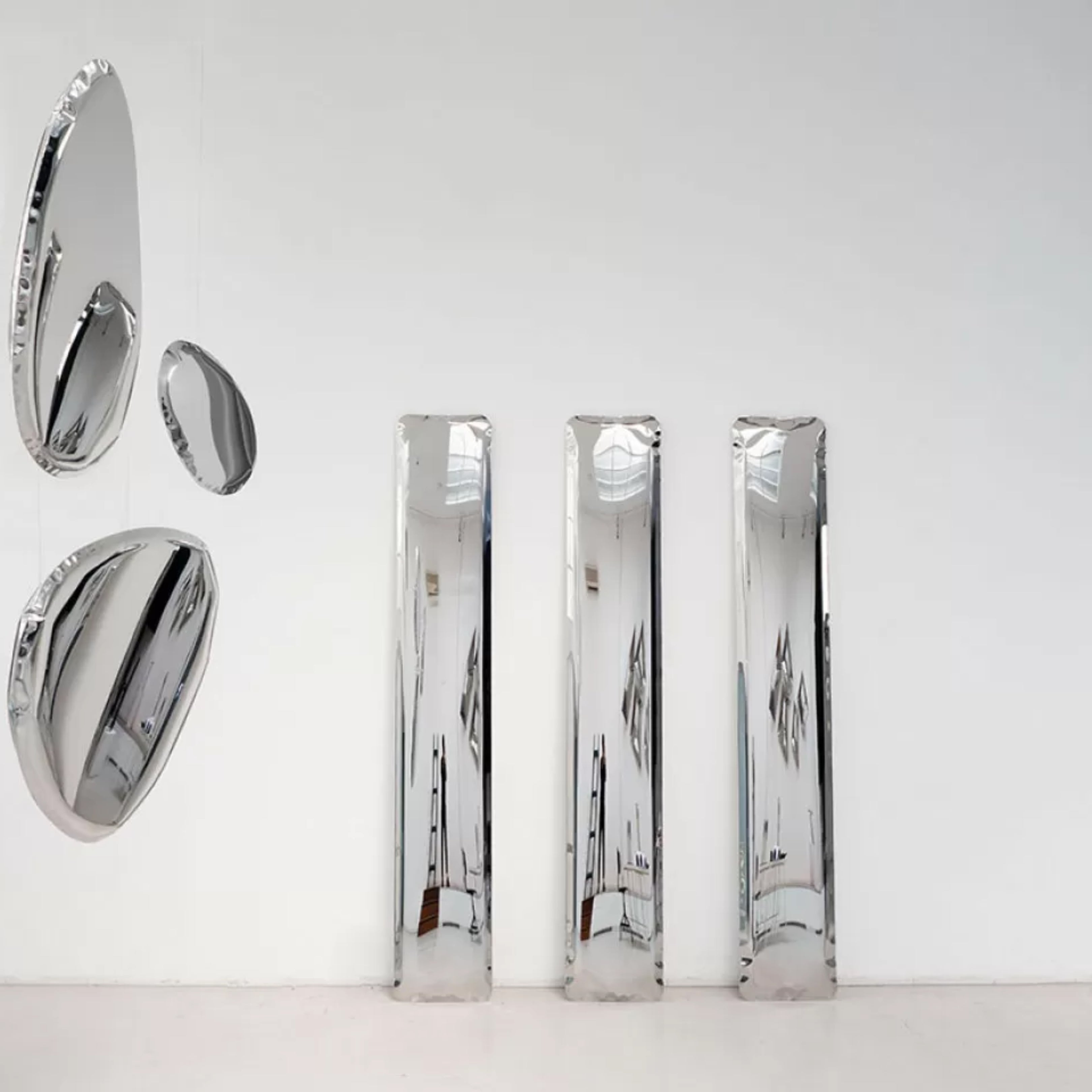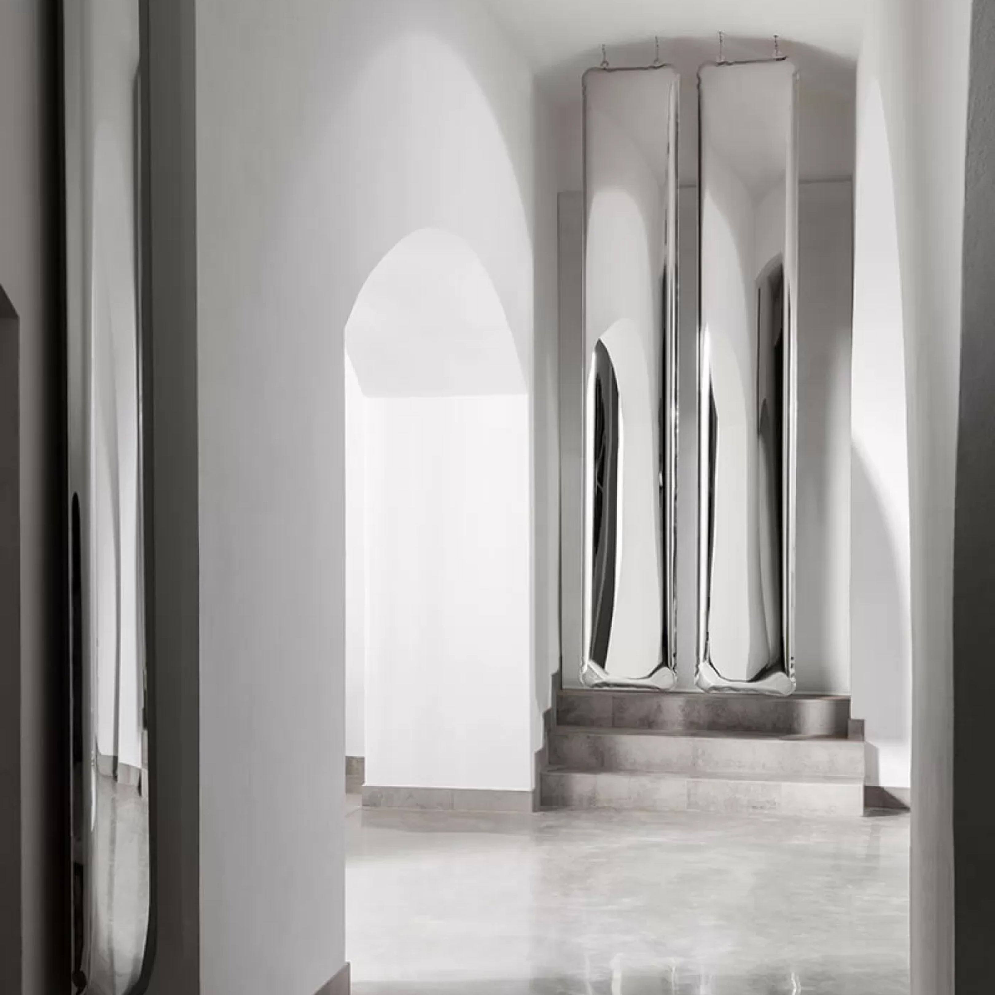 Zieta Studio’s TAFLA IQ Mirror is a nearly 10-foot-tall sculpture in steel, blending geometric clarity with organic distortion. Formed using FiDU technology, its mirrored surface reflects clearly at the center and warps subtly at the edges. Whether displayed vertically, horizontally, or in a series, TAFLA IQ brings bold presence and refined simplicity to modern interiors.